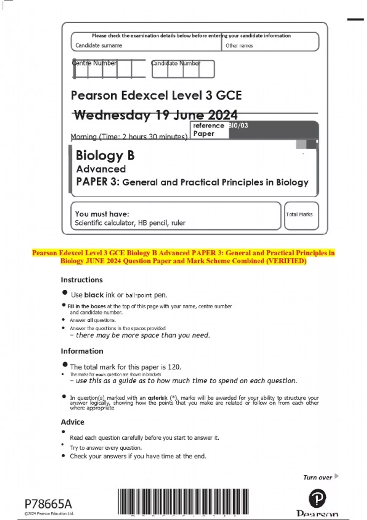 Pearson Edexcel Level 3 GCE Biology B Advanced PAPER 3: General and Practical Principles in Biology JUNE 2024 Question Paper and Mark Scheme Combined (VERIFIED)