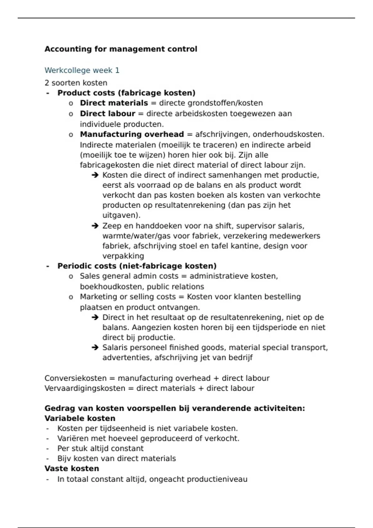 Aantekeningen van de hoorcolleges en werkcolleges van Accounting for management control van bedrijfskunde aan de RUG. Bevat alle tentamenstof.