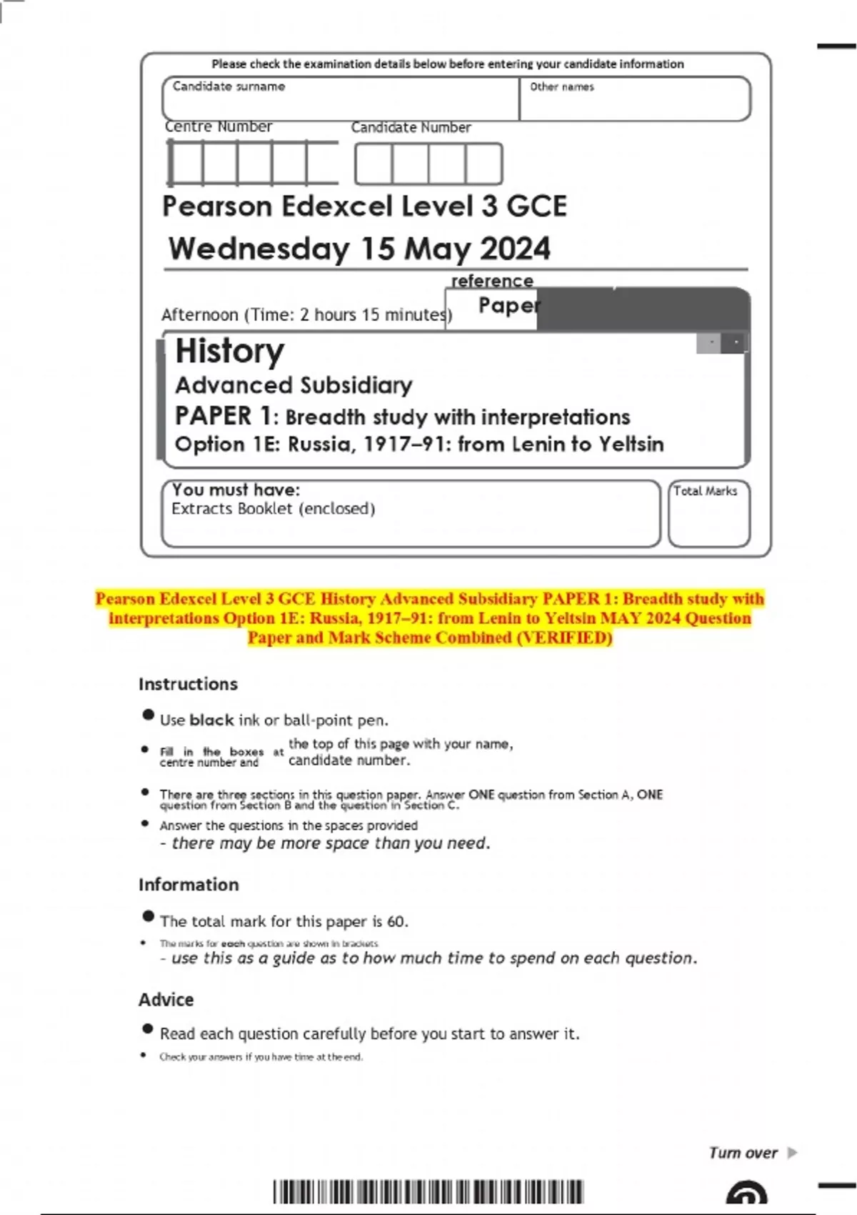 Pearson Edexcel Level 3 GCE History Advanced Subsidiary PAPER 1: Breadth study with interpretations Option 1E: Russia, 1917–91: from Lenin to Yeltsin MAY 2024 Question Paper and Mark Scheme Combined (VERIFIED)