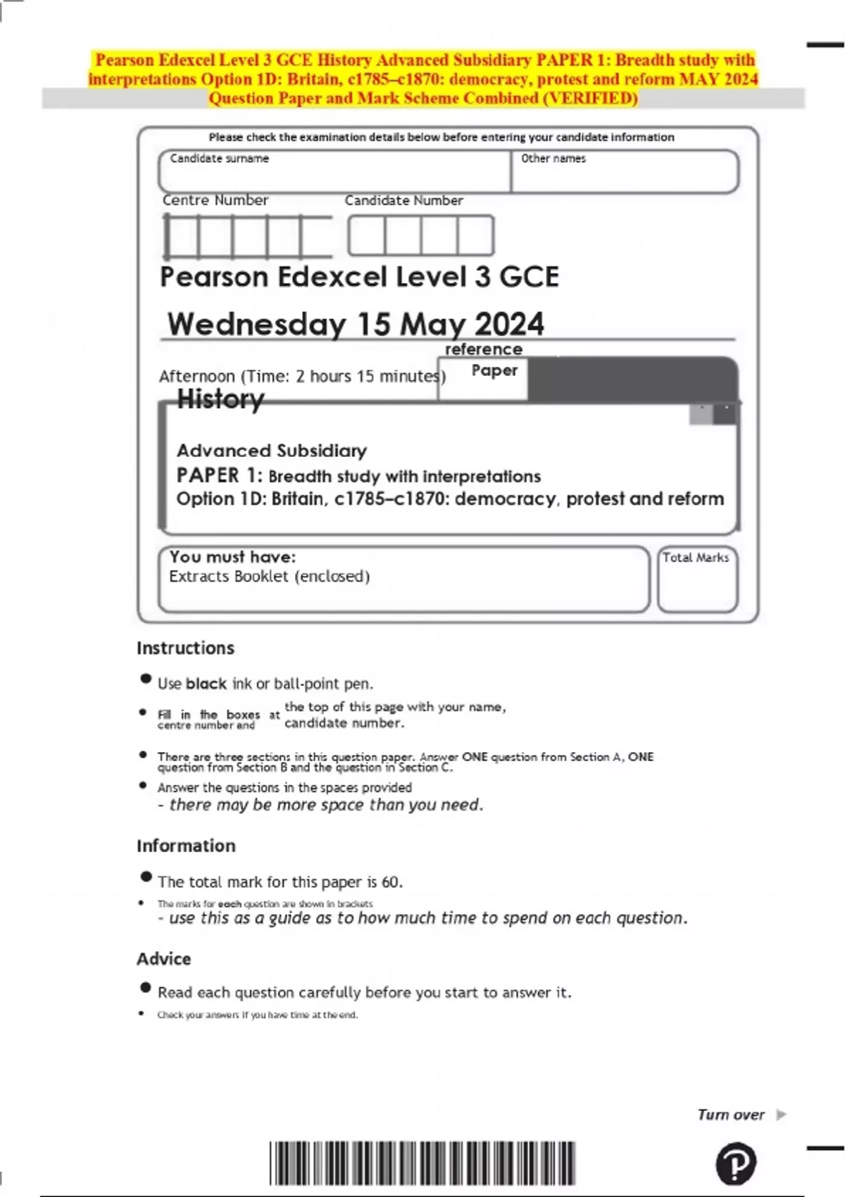 Pearson Edexcel Level 3 GCE History Advanced Subsidiary PAPER 1: Breadth study with interpretations Option 1D: Britain, c1785–c1870: democracy, protest and reform MAY 2024 Question Paper and Mark Scheme Combined (VERIFIED)