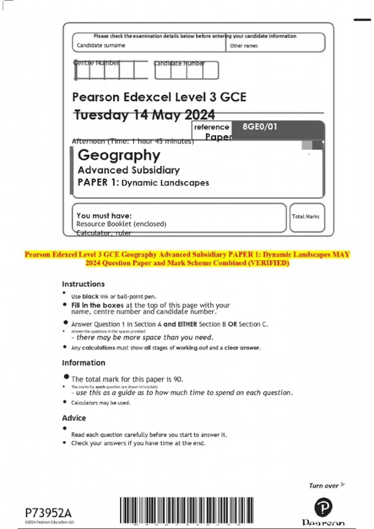 Pearson Edexcel Level 3 GCE Geography Advanced Subsidiary PAPER 1: Dynamic Landscapes MAY 2024 Question Paper and Mark Scheme Combined (VERIFIED)