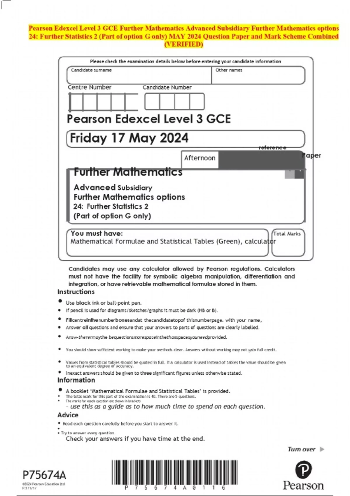 Pearson Edexcel Level 3 GCE Further Mathematics Advanced Subsidiary Further Mathematics options 24: Further Statistics 2 (Part of option G only) MAY 2024 Question Paper and Mark Scheme Combined (VERIFIED)