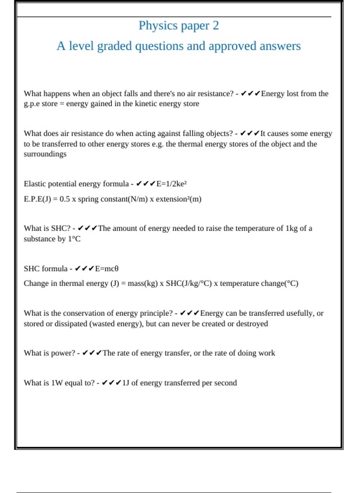 What happens when an object falls and there's no air resistance? - Energy lost from the g.p.e store = energy gained in the kinetic energy store What does air resistance do when acting against falling objects? - It causes some energy to be transferred to other energy stores e.g. the thermal energy stores of the object and the surroundings Elastic potential energy formula - E=1/2ke² E.P.E(J) = 0.5 x spring constant(N/m) x extension²(m) What is SHC? - The amount of energy needed to raise the temperature of 1kg of a substance by 1°C SHC formula - E=mcθ Change in thermal energy (J) = mass(kg) x SHC(J/kg/°C) x temperature change(°C) What is the conservation of energy principle? - Energy can be transferred usefully, or stored or dissipated (wasted energy), but can never be created or destroyed What is power? - The rate of energy transfer, or the rate of doing work What is 1W equal to? - 1J of energy transferred per second Power Equation 1 - E=Pt Energy transferred (J) = power(W) x time(s) Power Equation 2 - W=Pt Work done(J) = power(W) x time(s) What is conduction? - The process where vibrating particles transfer energy to neighboring particles Energy is transferred to thermal stores of the object - this energy is shared across the kinetic energy stores What is thermal conductivity? - A measure of how quickly energy is transferred through a material via conduction What is convection? - Where energetic particles move away from hotter to cooler regions Energy is transferred to the thermal energy stores of the object and is shared across the kinetic stores What do radiators create? - Convection currents Convection currents - process - 1) Energy is transferred from the radiator to the nearby air particles by conduction 2) The air by the radiator becomes warmer and less dense as the particles move quicker 3) The warm air rises and displaces the cooler air, which is then heated by the radiator 4) The previously heated air transfers energy to the surroundings - the air cools, becomes denser and sinks
