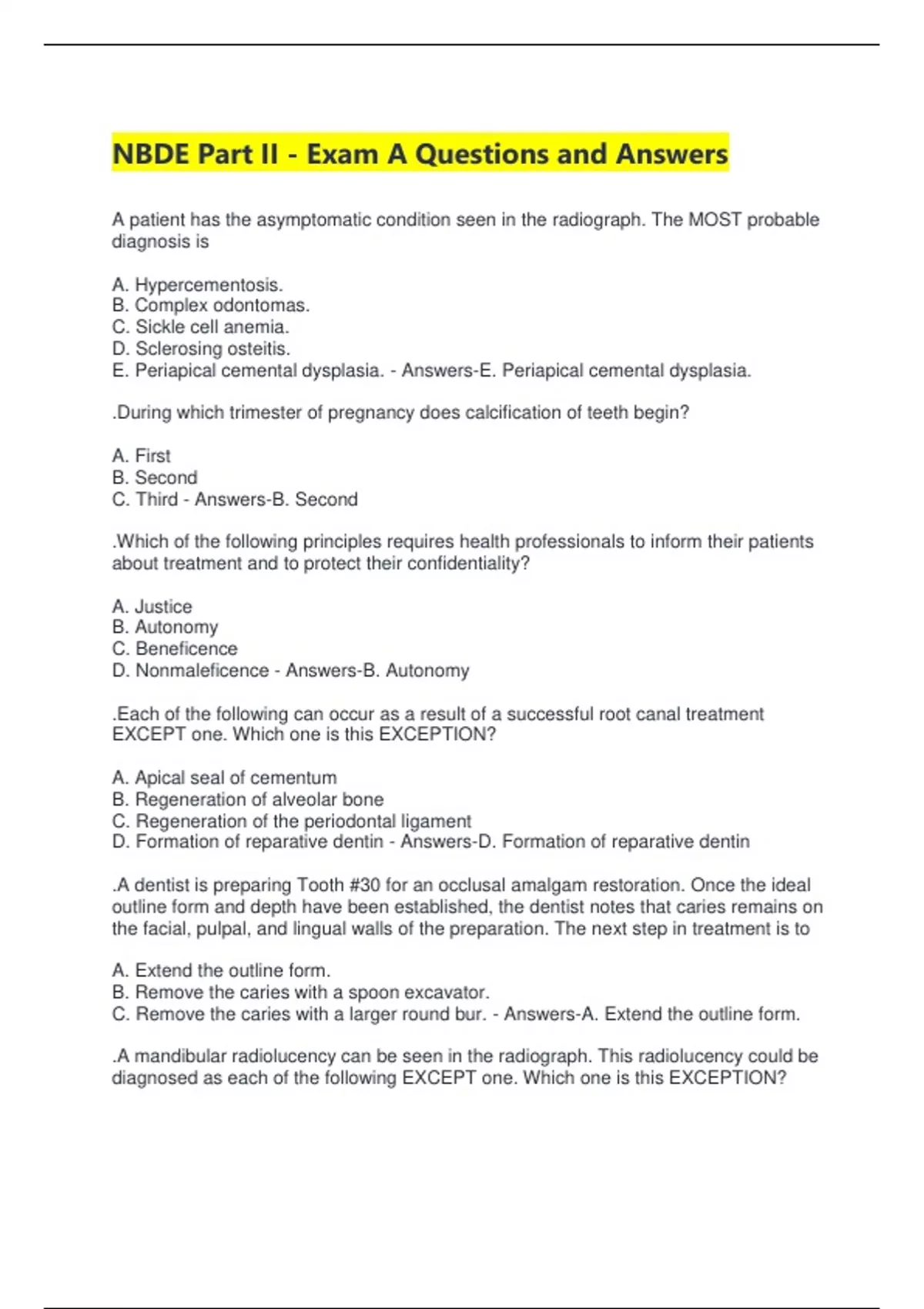 NBDE Part II - Exam A Questions and Answers A patient has the asymptomatic condition seen in the radiograph. The MOST probable diagnosis is A. Hypercementosis. B. Complex odontomas. C. Sickle cell anemia. D. Sclerosing osteitis. E. Periapical cemental dysplasia. - Answers-E. Periapical cemental dysplasia. .During which trimester of pregnancy does calcification of teeth begin? A. First B. Second C. Third - Answers-B. Second .Which of the following principles requires health professionals to inform their patients about treatment and to protect their confidentiality? A. Justice B. Autonomy C. Beneficence D. Nonmaleficence - Answers-B. Autonomy .Each of the following can occur as a result of a successful root canal treatment EXCEPT one. Which one is this EXCEPTION? A. Apical seal of cementum B. Regeneration of alveolar bone C. Regeneration of the periodontal ligament D. Formation of reparative dentin - Answers-D. Formation of reparative dentin .A dentist is preparing Tooth #30 for an occlusal amalgam restoration. Once the ideal outline form and depth have been established, the dentist notes that caries remains on the facial, pulpal, and lingual walls of the preparation. The next step in treatment is to A. Extend the outline form. B. Remove the caries with a spoon excavator. C. Remove the caries with a larger round bur. - Answers-A. Extend the outline form. .A mandibular radiolucency can be seen in the radiograph. This radiolucency could be diagnosed as each of the following EXCEPT one. Which one is this EXCEPTION? A. Odontogenic myxoma B. Ameloblastoma C. Traumatic bone cyst D. Central cell granuloma E. Odontogenic keratocyst - Answers-C. Traumatic bone cyst .A needle tract infection following an inferior alveolar block injection would initially involve which space? A. Pterygomandibular B. Sublingual C. Submandibular D. Lateral pharyngeal - Answers-A. Pterygomandibular .Which of the following characteristics most readily distinguishes amelogenesis imperfecta from dentinogenesis imperfecta? A. Radiographic appearance B. Hereditary background C. Presence of blue sclera D. Color of the teeth E. Associated hair loss - Answers-A. Radiographic appearance .Which of the following factors is the most critical in the determination of prognosis of a tooth with periodontal disease? A. Probing depth B. Mobility of the tooth C. Amount of attachment loss D. Presence of furcation involvement - Answers-C. Amount of attachment loss .Which of the following is derived from the unsaturated fatty acids in cell membranes? A. Histamine B. Serotonin C. Prostaglandins D. Bradykinin E. Endorphins - Answers-C. Prostaglandins .After a threshold stimulus, the cell-membrane permeability becomes altered. The liberation of which of the following transmitter substances causes this alteration? A. Acetylcholine B. Cholinesterase C. Hydroxycholine D. Acetylsalicylic acid - Answers-A. Acetylcholine .In the radiograph, a radiolucency appears at the apex of the maxillary canine. This finding represents a (an) A. Apical rarefying osteitis. B. Nasal fossa. C. Ameloblastoma. D. Maxillary sinus. - Answers-D. Maxillary sinus. .The strength of a soldered connector of a fixed partial denture is best enhanced by A. Using a higher carat solder. B. Increasing its height. C. Increasing its width. D. Increasing the gap. - Answers-B. Increasing its height. .During which of the following stages of tooth development does fused or geminated teeth occur? A. Apposition B. Calcification D. Eruption and exfoliation E. Initiation and proliferation - Answers-E. Initiation and proliferation .Through the Bloodborne Pathogen Standard, the Occupational Safety and Health Administration (OSHA) directs activity for each of the following EXCEPT one. Which one is this EXCEPTION? A. Using barrier techniques B. Using material safety data sheets (MSDS) C. Obtaining hepatitis B vaccinations D. Communicating hazards to employees E. Performing housekeeping - Answers-B. Using material safety data sheets (MSDS) .Which of the following is the most likely postoperative complication of bleaching a tooth that has not been adequately obturated? A. Fracture B. Discoloration C. Acute apical periodontitis D. Chronic apical periodontitis E. External cervical root resorption - Answers-C. Acute apical periodontitis .Which of the following is the best method for evaluating centric occlusion on a newly placed onlay restoration? A. Shim stock B. Articulating paper