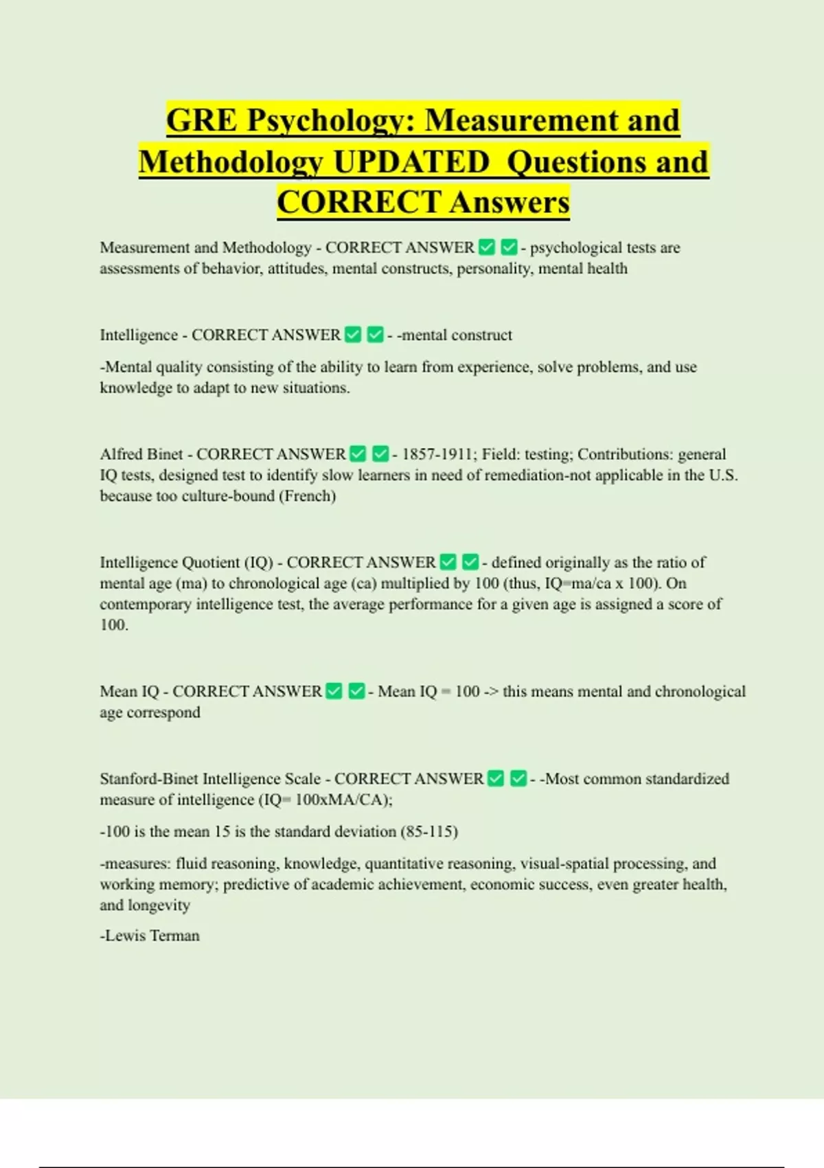 GRE Psychology: Measurement and Methodology UPDATED Questions and CORRECT Answers Measurement and Methodology - CORRECT ANSWER - psychological tests are assessments of behavior, attitudes, mental constructs, personality, mental health Intelligence - CORRECT ANSWER - -mental construct -Mental quality consisting of the ability to learn from experience, solve problems, and use knowledge to adapt to new situations