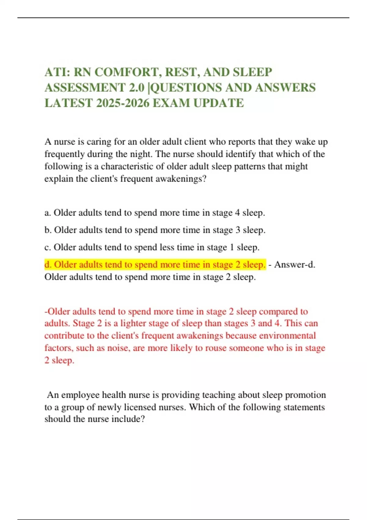 ATI: RN COMFORT, REST, AND SLEEP ASSESSMENT 2.0 |QUESTIONS AND ANSWERS LATEST EXAM UPDATE