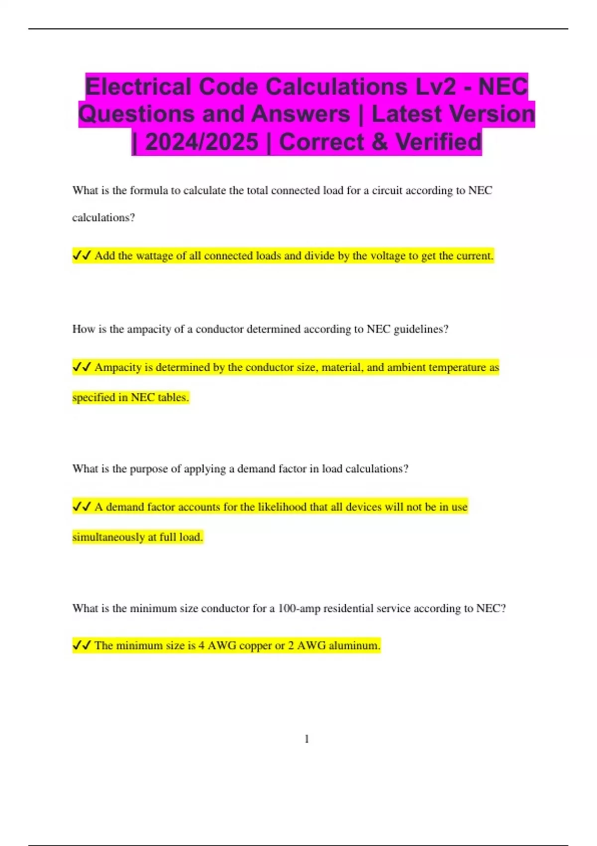 Electrical Code Calculations Lv2 - NEC Questions and Answers | Latest Version | 2024/2025 | Correct & Verified What is the formula to calculate the total connected load for a circuit according to NEC calculations? Add the wattage of all connected loads and divide by the voltage to get the current. How is the ampacity of a conductor determined according to NEC guidelines? Ampacity is determined by the conductor size, material, and ambient temperature as specified in NEC tables. What is the purpose of applying a demand factor in load calculations? A demand factor accounts for the likelihood that all devices will not be in use simultaneously at full load. What is the minimum size conductor for a 100-amp residential service according to NEC? The minimum size is 4 AWG copper or 2 AWG aluminum. 2 What is the formula for calculating voltage drop in a circuit? Voltage drop = Current x Resistance, where resistance depends on conductor size and length. What is the maximum number of outlets allowed on a 15-amp branch circuit according to NEC guidelines? The NEC does not specify a limit on the number of outlets, but the total load should not exceed the rating of the circuit. How do you calculate the size of a service-entrance conductor? The size is based on the ampacity of the service panel, considering the total demand load. What factors are considered when calculating load for a multi-family dwelling? The number of units, their individual load calculations, and any common areas or shared systems are considered. What is the maximum circuit breaker size for a 12 AWG copper conductor according to NEC? The maximum circuit breaker size for 12 AWG copper is 20 amps. 3 How is the total load for a feeder circuit calculated? Add the connected loads of all branch circuits served by the feeder, and apply any appropriate demand factors. What is the required distance for overcurrent protection from the load center? Overcurrent protection should be installed as close as possible to the load center to limit the amount of unprotected wiring. What is the method to calculate the ampacity of a conductor in a temperature above 30°C? Use the adjustment factors from NEC Table 310.15(B)(2)(a) to modify the ampacity based on the temperature. How do you determine the appropriate conductor size for a 240-volt circuit? The conductor size is determined by the amperage rating of the circuit, following NEC guidelines for voltage and wire material. What is the minimum grounding electrode conductor size for a 400-amp service? The minimum size is 2 AWG copper or 1 AWG aluminum. 4 How do you calculate the total wattage of a circuit with both resistive and inductive loads? Add the total wattage of resistive loads and calculate the volt-amperes (VA) for inductive loads, then combine the totals. What is the maximum permissible voltage drop for branch circuits according to NEC? The maximum allowable voltage drop is generally