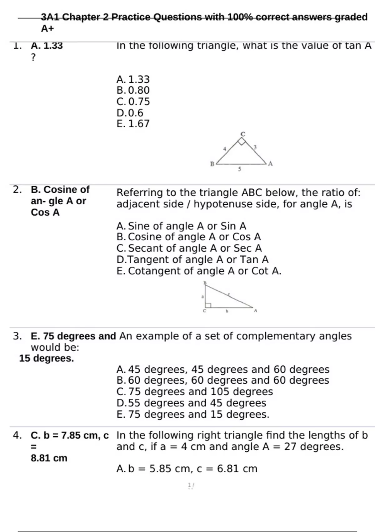1. A. 1.33 In the following triangle, what is the value of tan A