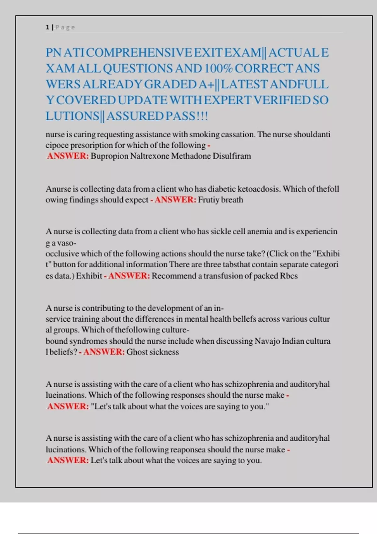 PN ATI COMPREHENSIVE EXIT EXAM ACTUAL EXAM ALL QUESTIONS AND 100% CORRECT ANSWERS ALREAD GRADED A+