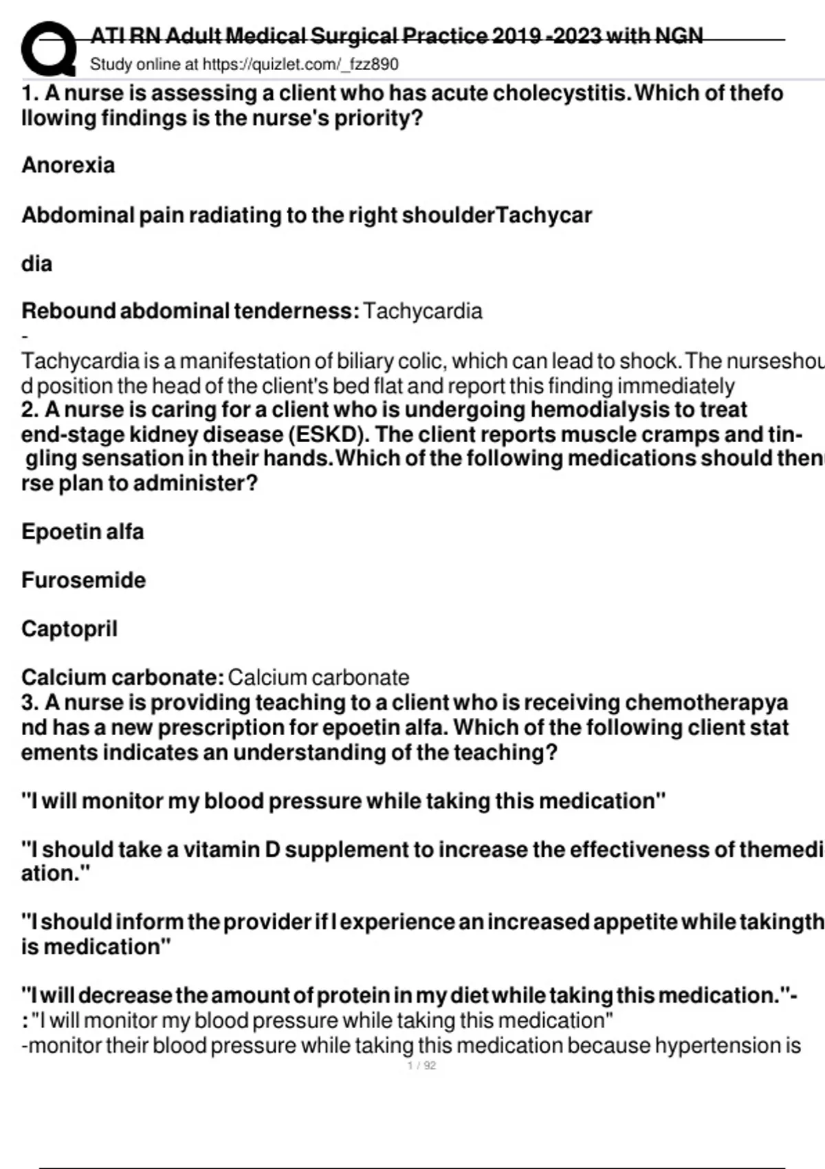 1. A nurse is assessing a client who has acute cholecystitis. Which of thefo