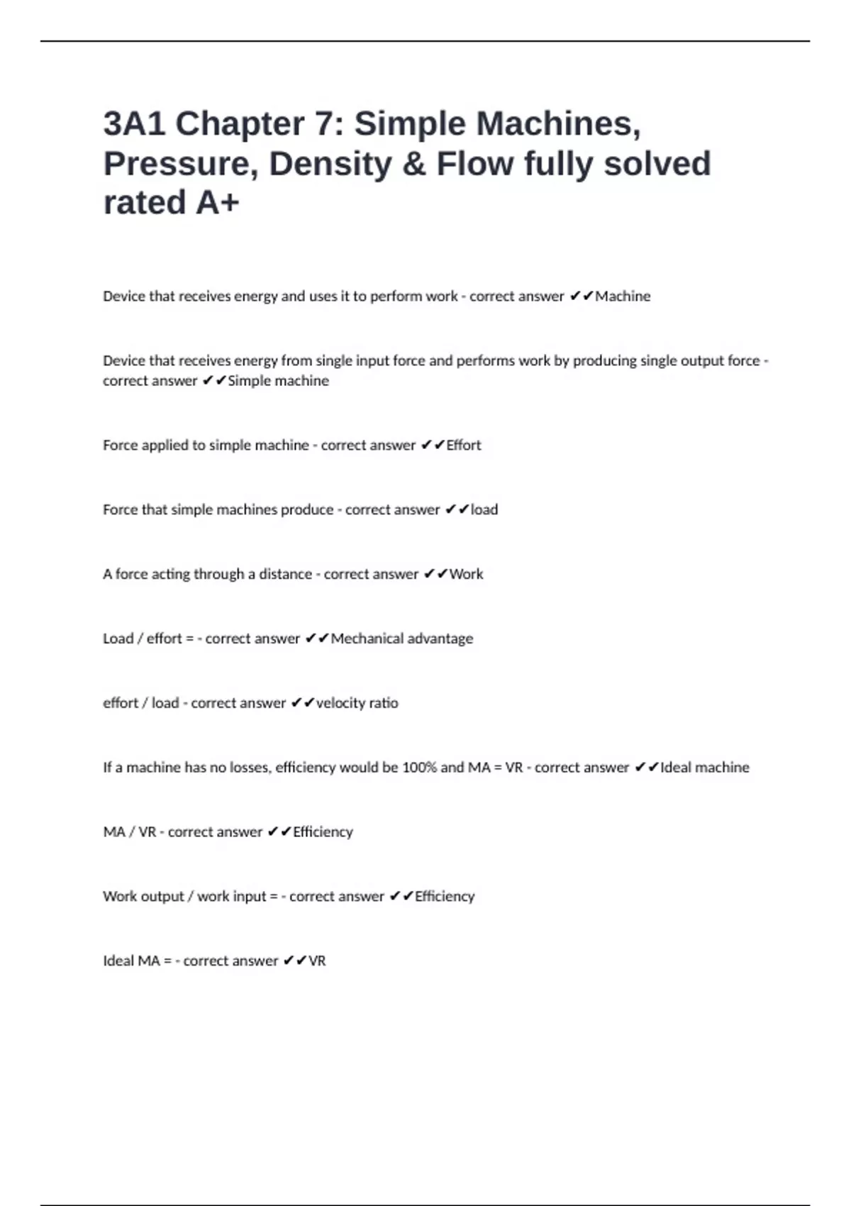3A1 Chapter 7: Simple Machines, Pressure, Density & Flow fully solved rated A+