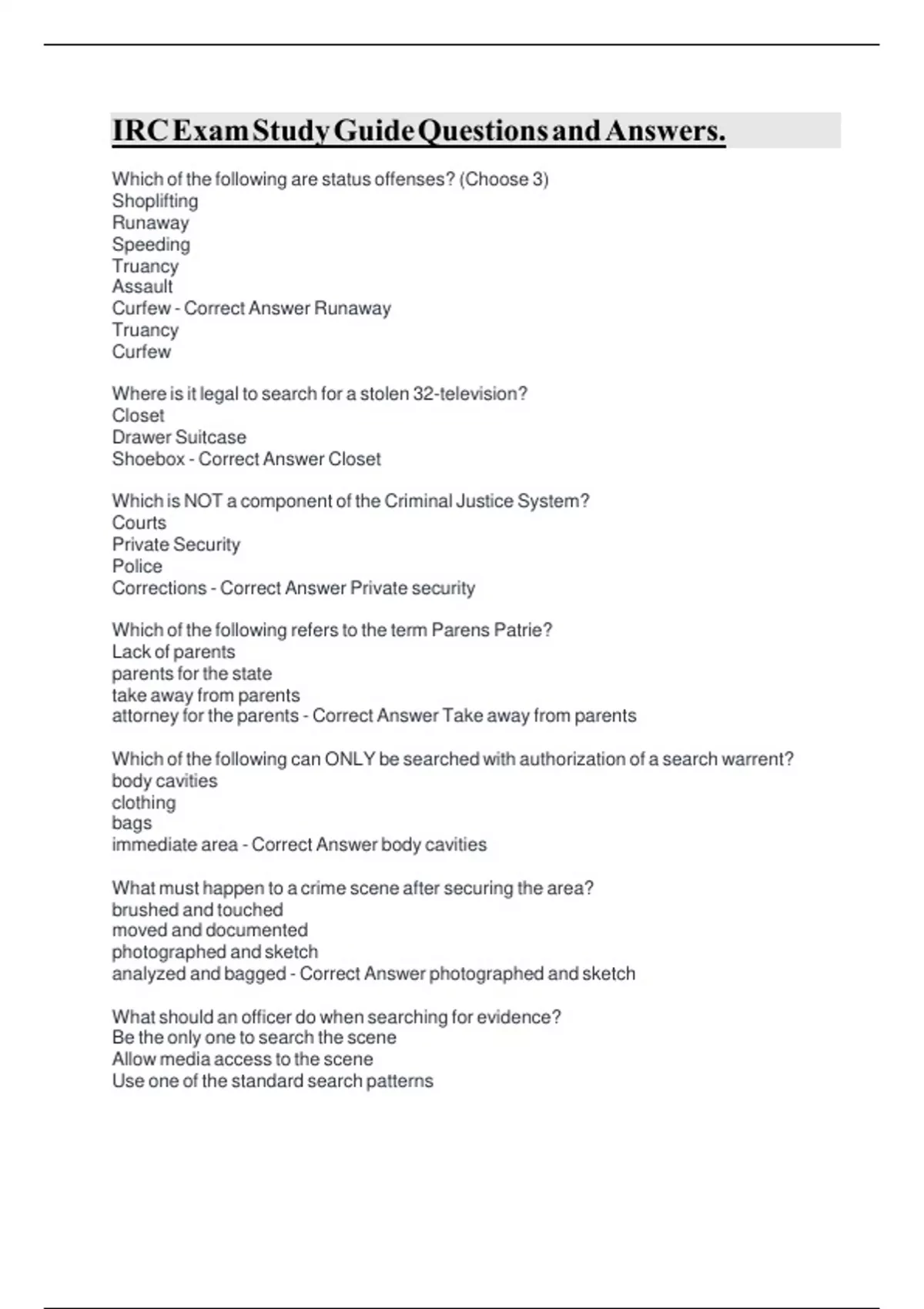 IRCExamStudyGuideQuestionsandAnswers. Which of the following are status offenses? (Choose 3) Shoplifting Runaway Speeding Truancy Assault Curfew - Correct Answer Runaway Truancy Curfew Where is it legal to search for a stolen 32-television? Closet Drawer Suitcase Shoebox - Correct Answer Closet Which is NOT a component of the Criminal Justice System? Courts Private Security Police Corrections - Correct Answer Private security Which of the following refers to the term Parens Patrie? Lack of parents parents for the state take away from parent