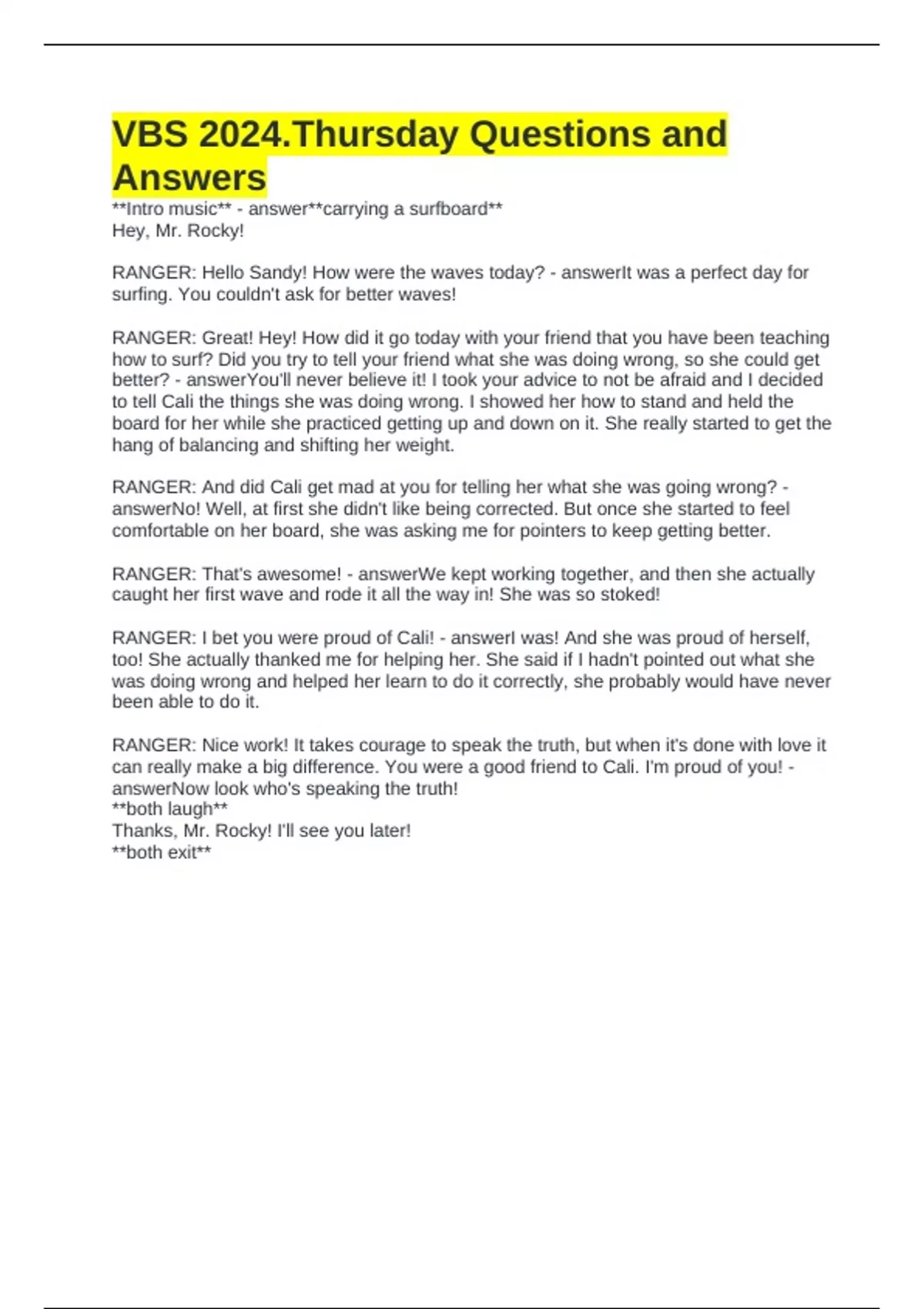 VBS 2024.Thursday Questions and Answers *Intro music* *carrying a surfboard* Hey, Mr. Rocky! RANGER: Hello Sandy! How were the waves today? It was a perfect day for surfing. You couldn't ask for better waves! RANGER: Great! Hey! How did it go today with your friend that you have been teaching how to surf? Did you try to tell your friend what she was doing wrong, so she could get better? You'll never believe it! I took your advice to not be afraid and I decided to tell Cali the things she was doing wrong. I showed her how to stand and held the board for her while she practiced getting up and down on it. She really started to get the hang of balancing and shifting her weight. RANGER: And did Cali get mad at you for telling her what she was going wrong? No! Well, at first she didn't like being corrected. But once she started to feel comfortable on her board, she was asking me for pointers to keep getting better. RANGER: That's awesome! We kept working together, and then she actually caught her first wave and rode it all the way in! She was so stoked! RANGER: I bet you were proud of Cali! I was! And she was proud of herself, too! She actually thanked me for helping her. She said if I hadn't pointed out what she was doing wrong and helped her learn to do it correctly, she probably would have never been able to do it.