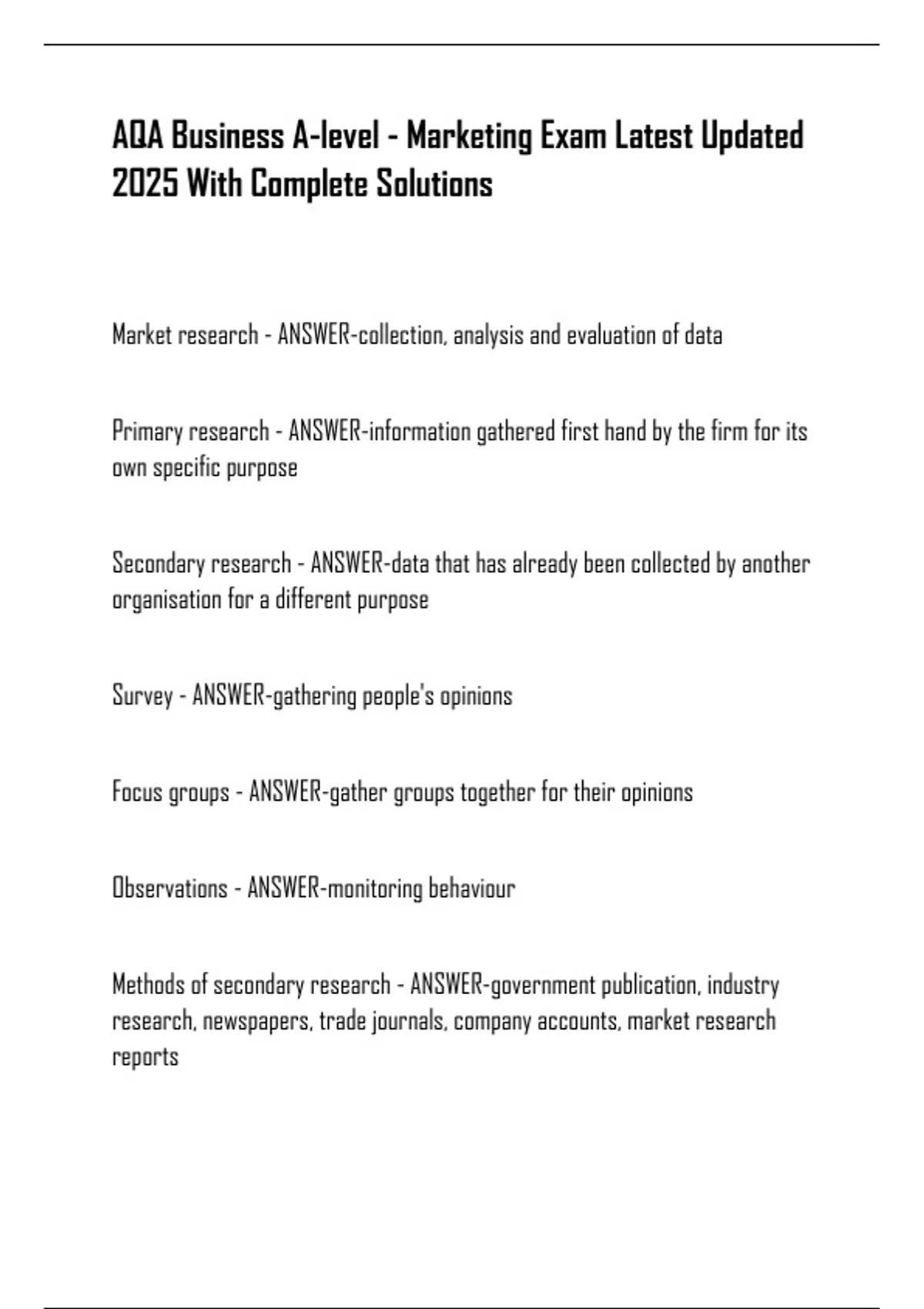 AQA Business A-level - Marketing Exam Latest Updated 2025 With Complete Solutions Market research - ANSWER-collection, analysis and evaluation of data Primary research - ANSWER-information gathered first hand by the firm for its own specific purpose Secondary research - ANSWER-data that has already been collected by another organisation for a different purpose Survey - ANSWER-gathering people's opinions Focus groups - ANSWER-gather groups together for their opinions Observations - ANSWER-monitoring behaviour Methods of secondary research - ANSWER-government publication, industry research, newspapers, trade journals, company accounts, market research reports Qualitative research - ANSWER-information gathered based on peoples opinions Quantitative research - ANSWER-numerical and statistical information Sampling - ANSWER-group of respondents whose views, characteristics and behaviour represent the overall target market Random sampling - ANSWER-all members of the population have equal change of being selected in the sample Quota sampling - ANSWER-sample chosen with the aim of representing the overall population Stratified sampling - ANSWER-a group of respondents are randomly selected but from within very specific subsets such as gender, age or income levels