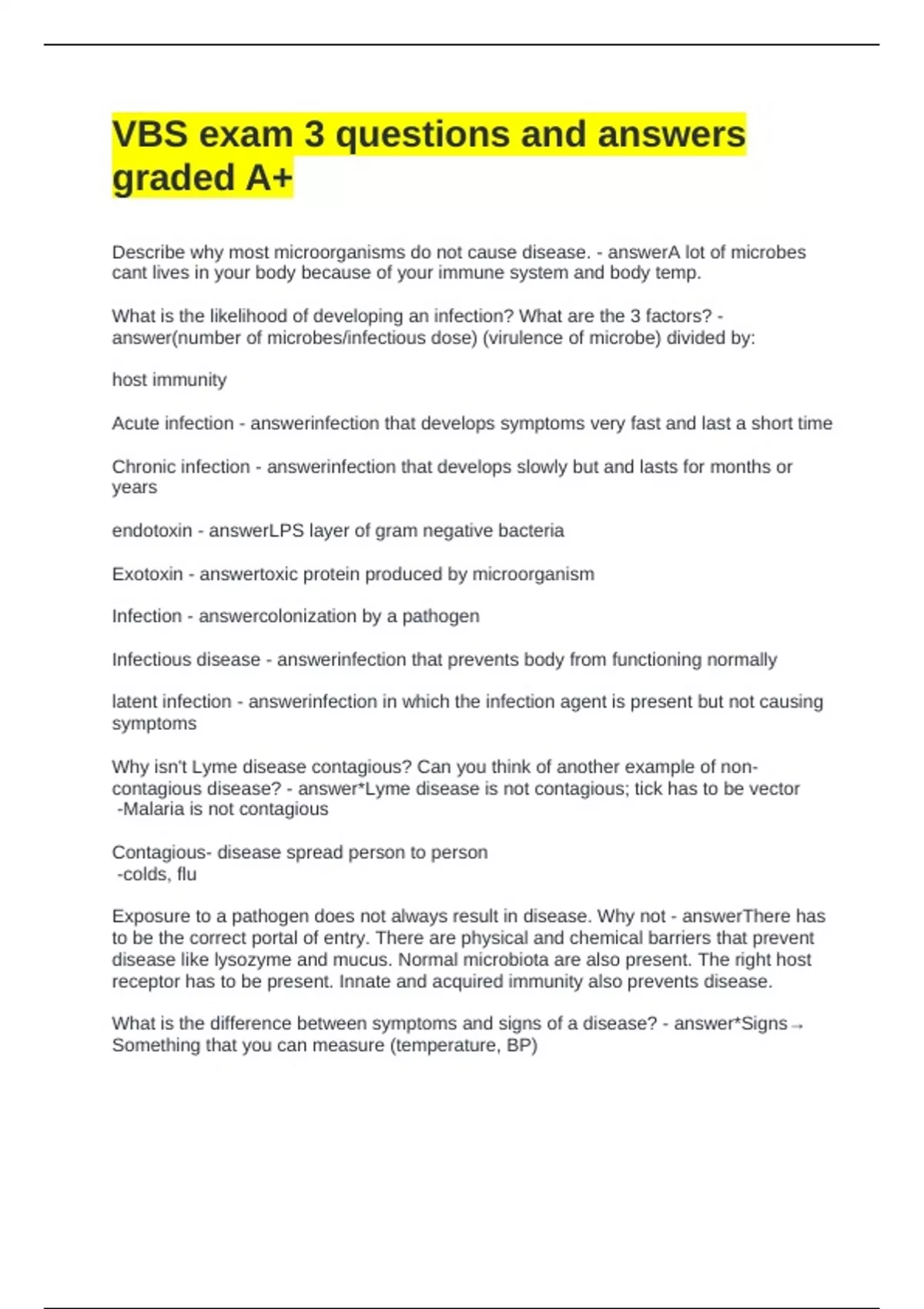 VBS exam 3 questions and answers graded A+ Describe why most microorganisms do not cause disease. A lot of microbes cant lives in your body because of your immune system and body temp. What is the likelihood of developing an infection? What are the 3 factors? (number of microbes/infectious dose) (virulence of microbe) divided by: host immunity Acute infection infection that develops symptoms very fast and last a short time Chronic infection infection that develops slowly but and lasts for months or years endotoxin LPS layer of gram negative bacteria Exotoxin toxic protein produced by microorganism Infection colonization by a pathogen Infectious disease infection that prevents body from functioning normally latent infection infection in which the infection agent is present but not causing symptoms Why isn't Lyme disease contagious? Can you think of another example of non-contagious disease? *Lyme disease is not contagious; tick has to be vector -Malaria is not contagious Contagious- disease spread person to person -colds, flu Exposure to a pathogen does not always result in disease. Why not There has to be the correct portal of entry. There are physical and chemical barriers that prevent disease like lysozyme and mucus. Normal microbiota are also present. The right host receptor has to be present. Innate and acquired immunity also prevents disease. What is the difference between symptoms and signs of a disease? *Signs→ Something that you can measure (temperature, BP) *Symptoms→ harder to measure (something patient describes to you like headache or nausea)