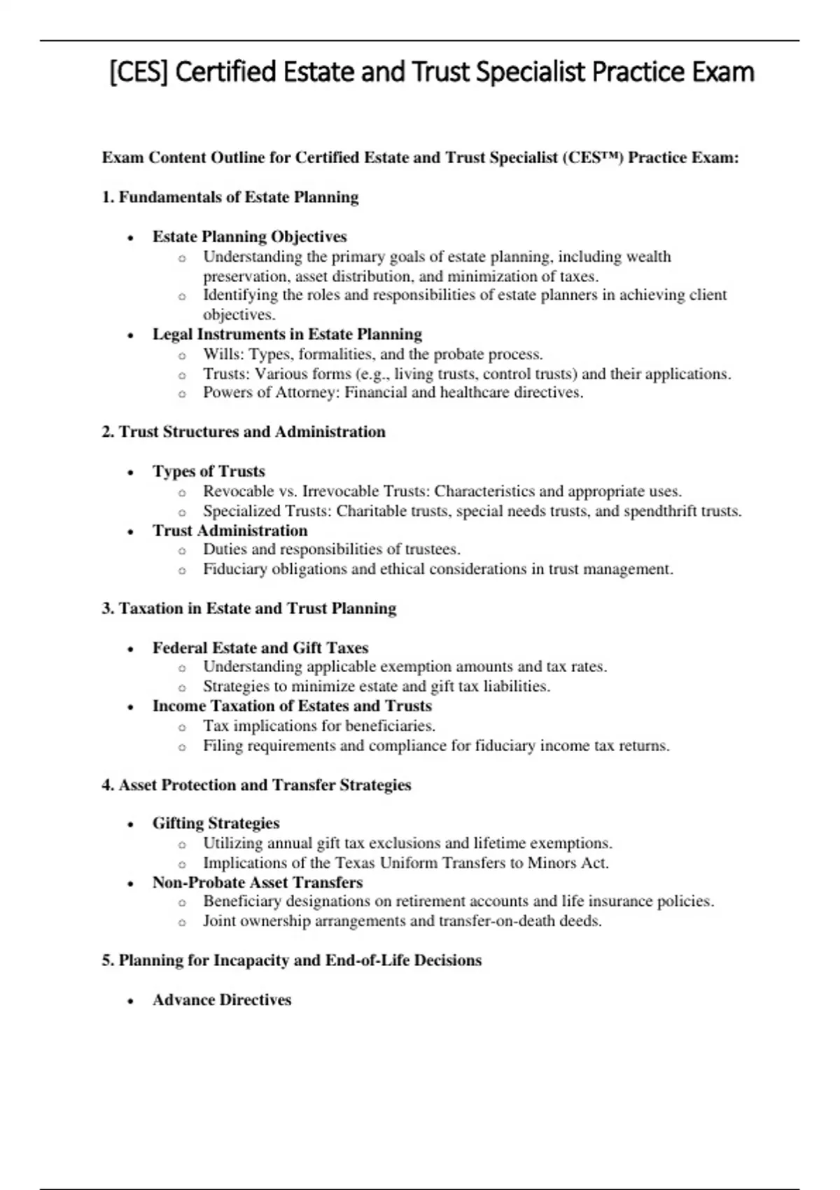 Exam Content Outline for Certified Estate and Trust Specialist (CES™) Practice Exam: 1. Fundamentals of Estate Planning • Estate Planning Objectives o Understanding the primary goals of estate planning, including wealth preservation, asset distribution, and minimization of taxes. o Identifying the roles and responsibilities of estate planners in achieving client objectives. • Legal Instruments in Estate Planning o Wills: Types, formalities, and the probate process. o Trusts: Various forms (e.g., living trusts, control trusts) and their applications. o Powers of Attorney: Financial and healthcare directives. 2. Trust Structures and Administration • Types of Trusts o Revocable vs. Irrevocable Trusts: Characteristics and appropriate uses. o Specialized Trusts: Charitable trusts, special needs trusts, and spendthrift trusts. • Trust Administration o Duties and responsibilities of trustees. o Fiduciary obligations and ethical considerations in trust management. 3. Taxation in Estate and Trust Planning • Federal Estate and Gift Taxes o Understanding applicable exemption amounts and tax rates. o Strategies to minimize estate and gift tax liabilities. • Income Taxation of Estates and Trusts o Tax implications for beneficiaries. o Filing requirements and compliance for fiduciary income tax returns. 4. Asset Protection and Transfer Strategies • Gifting Strategies o Utilizing annual gift tax exclusions and lifetime exemptions. o Implications of the Texas Uniform Transfers to Minors Act. • Non-Probate Asset Transfers o Beneficiary designations on retirement accounts and life insurance policies. o Joint ownership arrangements and transfer-on-death deeds. 5. Planning for Incapacity and End-of-Life Decisions • Advance Directives o Establishing durable powers of attorney for healthcare and finances. o Creating living wills and healthcare proxies. • Guardianship Considerations o Legal procedures for appointing guardians for minors and incapacitated adults. o Alternatives to guardianship, such as management trusts. 6. Post-Mortem Estate Administration • Probate Process o Steps involved in probating a will and administering an estate. o Distinctions between dependent and independent administrations. • Estate Settlement o Addressing debts, claims, and distribution of assets to beneficiaries. o Tax filings and compliance during estate administration. 7. Ethical and Professional Responsibilities • Standards of Practice o Adhering to the IBF Code of Ethics and placing client interests above all else. o Maintaining competence through continuing education and staying informed of legislative changes. • Client Relations o Communicating complex estate planning concepts clearly and effectively. o Ensuring confidentiality and managing conflicts of interest. This comprehensive outline serves as a guide for professionals preparing for the Certified Estate and Trust Specialist (CES™) practice exam, ensuring they possess the necessary knowledge and skills to provide expert estate and trust planning services to their clients.