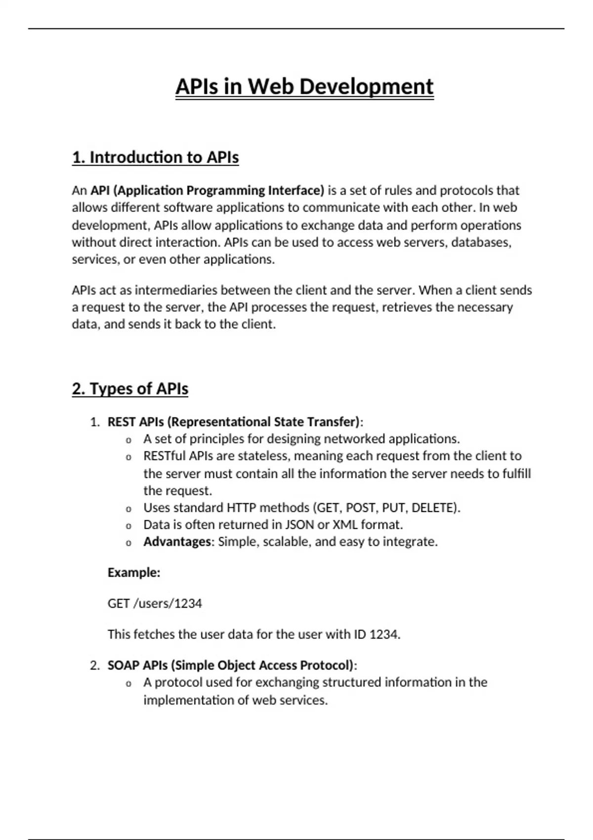 This document explores the importance of APIs in web development, covering REST and GraphQL APIs and how to integrate them into web applications. It explains the principles of handling HTTP requests, working with JSON data, and optimizing API performance. Aimed at developers looking to understand how APIs drive modern web development and enhance the functionality of web applications.