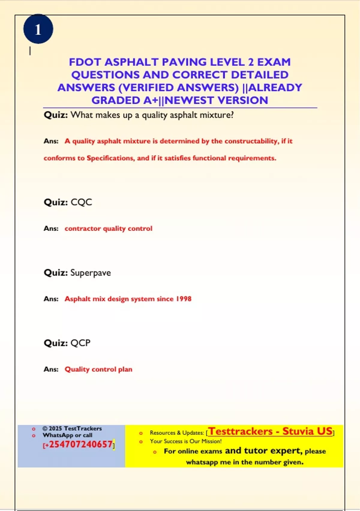 FDOT ASPHALT PAVING LEVEL 2 EXAM QUESTIONS AND CORRECT DETAILED ANSWERS (VERIFIED ANSWERS) ||ALREADY GRADED A+||NEWEST VERSIONFDOT ASPHALT PAVING LEVEL 2 EXAM QUESTIONS AND CORRECT DETAILED ANSWERS (VERIFIED ANSWERS) ||ALREADY GRADED A+||NEWEST VERSION