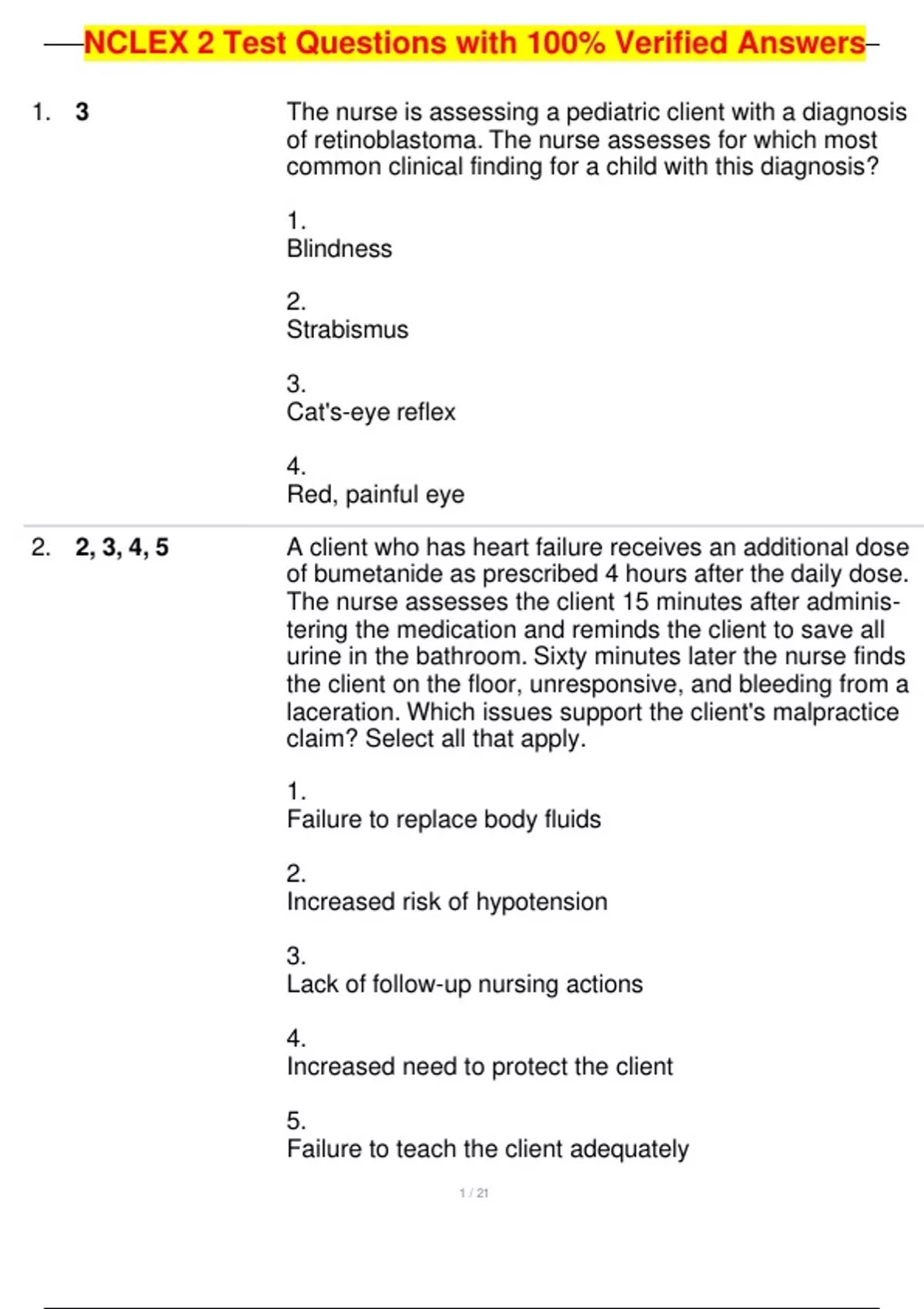 NCLEX 2 Test Questions with 100% Verified Answers 1. 3 2. 2, 3, 4, 5 The nurse is assessing a pediatric client with a diagnosis of retinoblastoma. The nurse assesses for which most common clinical finding for a child with this diagnosis? 1. Blindness 2. Strabismus 3. Cat's-ey