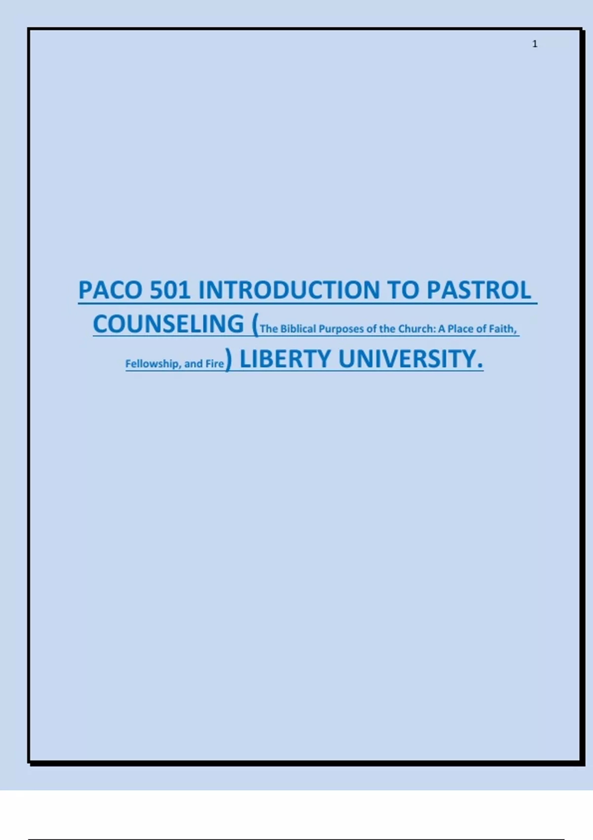 PACO 501 INTRODUCTION TO PASTROL COUNSELING (The Biblical Purposes of the Church: A Place of Faith, Fellowship, and Fire) LIBERTY UNIVERSITY