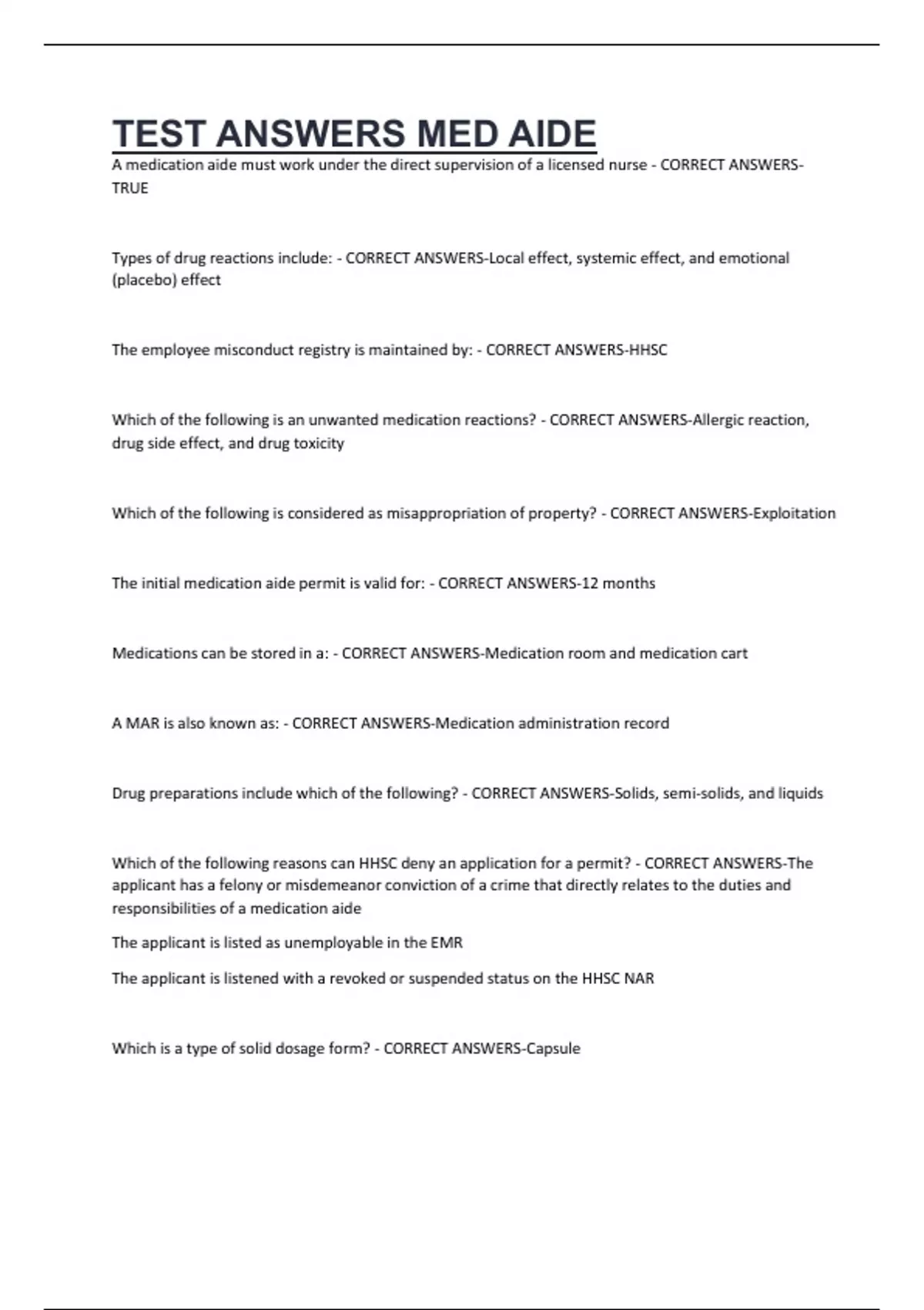 TEST ANSWERS MED AIDE A medication aide must work under the direct supervision of a licensed nurse - CORRECT ANSWERSTRUE Types of drug reactions include: - CORRECT ANSWERS-Local effect, systemic effect, and emotional (placebo) effect The employee misconduct registry is maintained by: - CORRECT ANSWERS-HHSC Which of the following is an unwanted medication reactions? - CORRECT ANSWERS-Allergic reaction, drug side effect, and drug toxicity Which of the following is considered as misappropriation of property? - CORRECT ANSWERS-Exploitation The initial medication aide permit is valid for: - CORRECT ANSWERS-12 months Medications can be stored in a: - CORRECT ANSWERS-Medication room and medication cart A MAR is also known as: - CORRECT ANSWERS-Medication administration record Drug preparations include which of the following? - CORRECT ANSWERS-Solids, semi-solids, and liquids Which of the following reasons can HHSC deny an application for a permit? - CORRECT ANSWERS-The applicant has a felony or misdemeanor conviction of a crime that directly relates to the duties and responsibilities of a medication aide The applicant is listed as unemployable in the EMR The applicant is listened with a revoked or suspended status on the HHSC NAR Which is a type of solid dosage form? - CORRECT ANSWERS-Capsule
