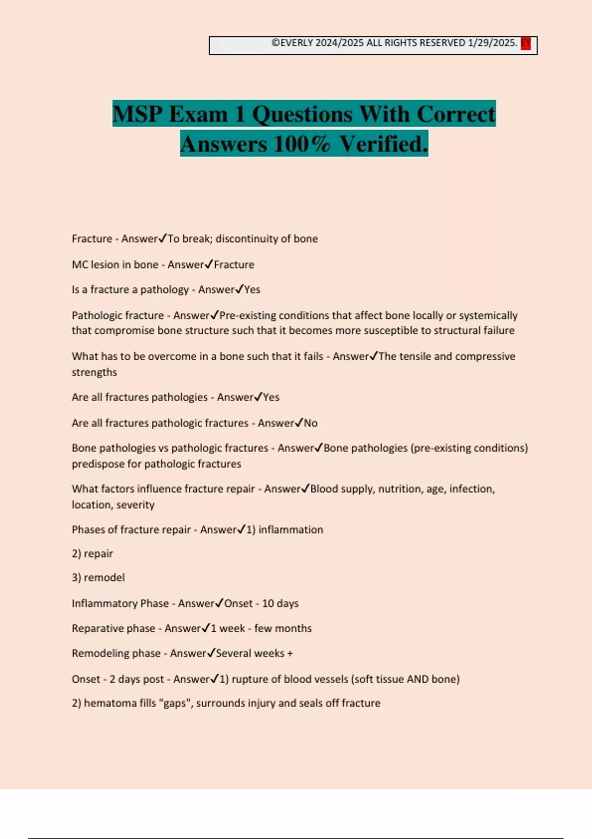 ©EVERLY 2024/2025 ALL RIGHTS RESERVED 1/29/2025. EY MSP Exam 1 Questions With Correct Answers 100% Verified. Fracture - AnswerTo break; discontinuity of bone MC lesion in bone - AnswerFracture Is a fracture a pathology - AnswerYes Pathologic fracture - AnswerPre-existing conditions that affect bone locally or systemically that compromise bone structure such that it becomes more susceptible to structural failure What has to be overcome in a bone such that it fails - AnswerThe tensile and compressive strengths Are all fractures pathologies - AnswerYes Are all fractures pathologic fractures - AnswerNo Bone pathologies vs pathologic fractures - AnswerBone pathologies (pre-existing conditions) predispose for pathologic fractures What factors influence fracture repair - AnswerBlood supply, nutrition, age, infection, location, severity Phases of fracture repair - Answer1) inflammation 2) repair 3) remodel Inflammatory Phase - AnswerOnset - 10 days Reparative phase - Answer1 week - few months Remodeling phase - AnswerSeveral weeks + Onset - 2 days post - Answer1) rupture of blood vessels (soft tissue AND bone) 2) hematoma fills "gaps", surrounds injury and seals off fracture ©EVERLY 2024/2025 ALL RIGHTS RESERVED 1/29/2025. EY 3) tearing of periosteum (what hurts) 4) necrosis of bone and soft tissue 2 - 5 days post - Answer1) fibrin mesh develops 2) fibroblasts migrate into area 3) cartilage forms 4) necrosis + macrophage activity continues 5 - 10 days post - Answer1) procallus forms replacing fibrin mesh 2) macrophages continue Radiographic findings - inflammatory phase - AnswerDiscontinuity and displacement Reparative phase - Answer1) osteoclasts/PMN clean up debris 2) extensive neovascularization *** 3) callus formation Radiographic findings - reparative phase - AnswerWidening of fracture and hazy cloud Remodeling phase - Answer1) callus seals the bone 2) bone adjusts strength/shape Radiographic findings - remodeling phase - AnswerSolid mature callus Who's law describes the remodeling phase? - AnswerWolffe's Law Clinical Union - AnswerWhen cast is removed; implies stable fracture Malunion - AnswerHeals with residual deformity Delayed Union - AnswerFails to heal up to 6 months post fracture Non-union - AnswerFails to heal after 6 months Pseudoarthrosis - AnswerNon-union fracture heals with pseudo joint Transverse fracture - AnswerHigh velocity injury; often pathologic aka Paget's "banana" fracture Oblique fracture - AnswerVery common; 45 degrees to long axis Spiral fracture - AnswerTorsion/axi