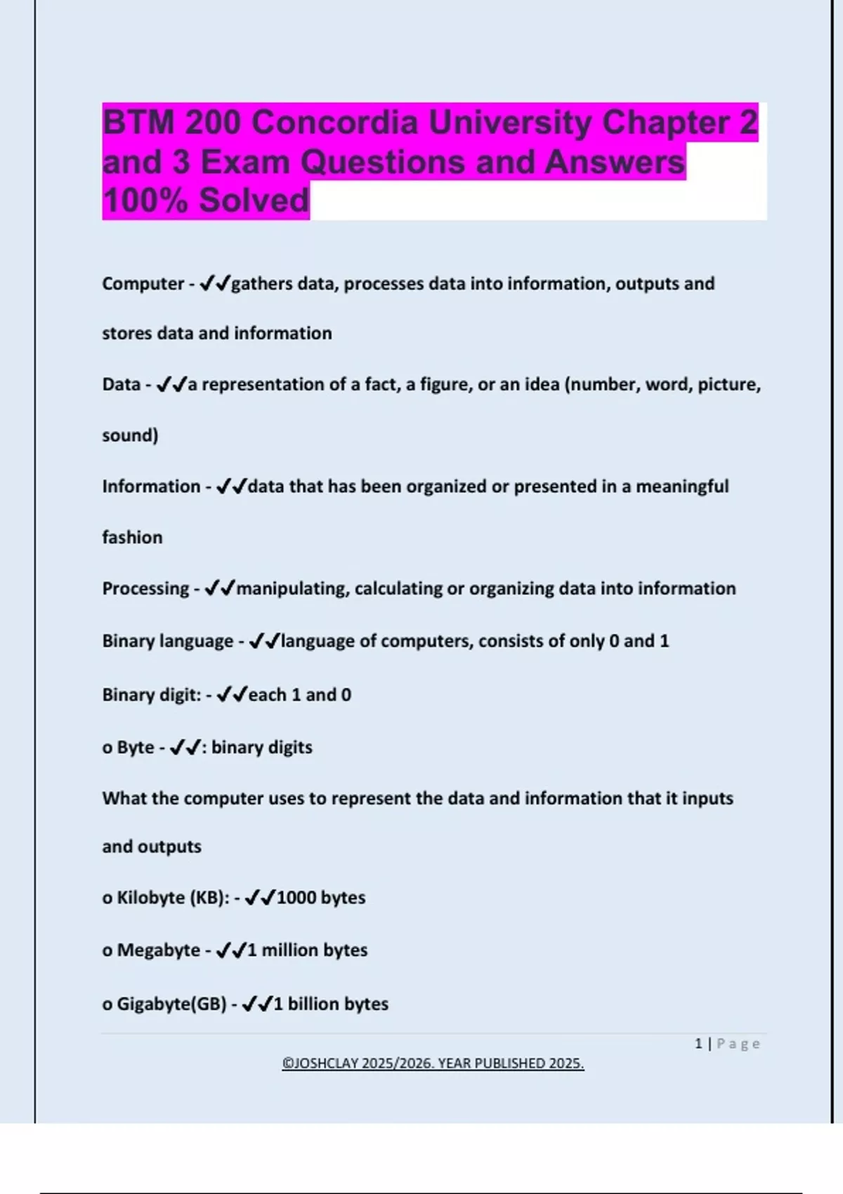 o Kilobyte (KB): - ✔✔1000 bytes
