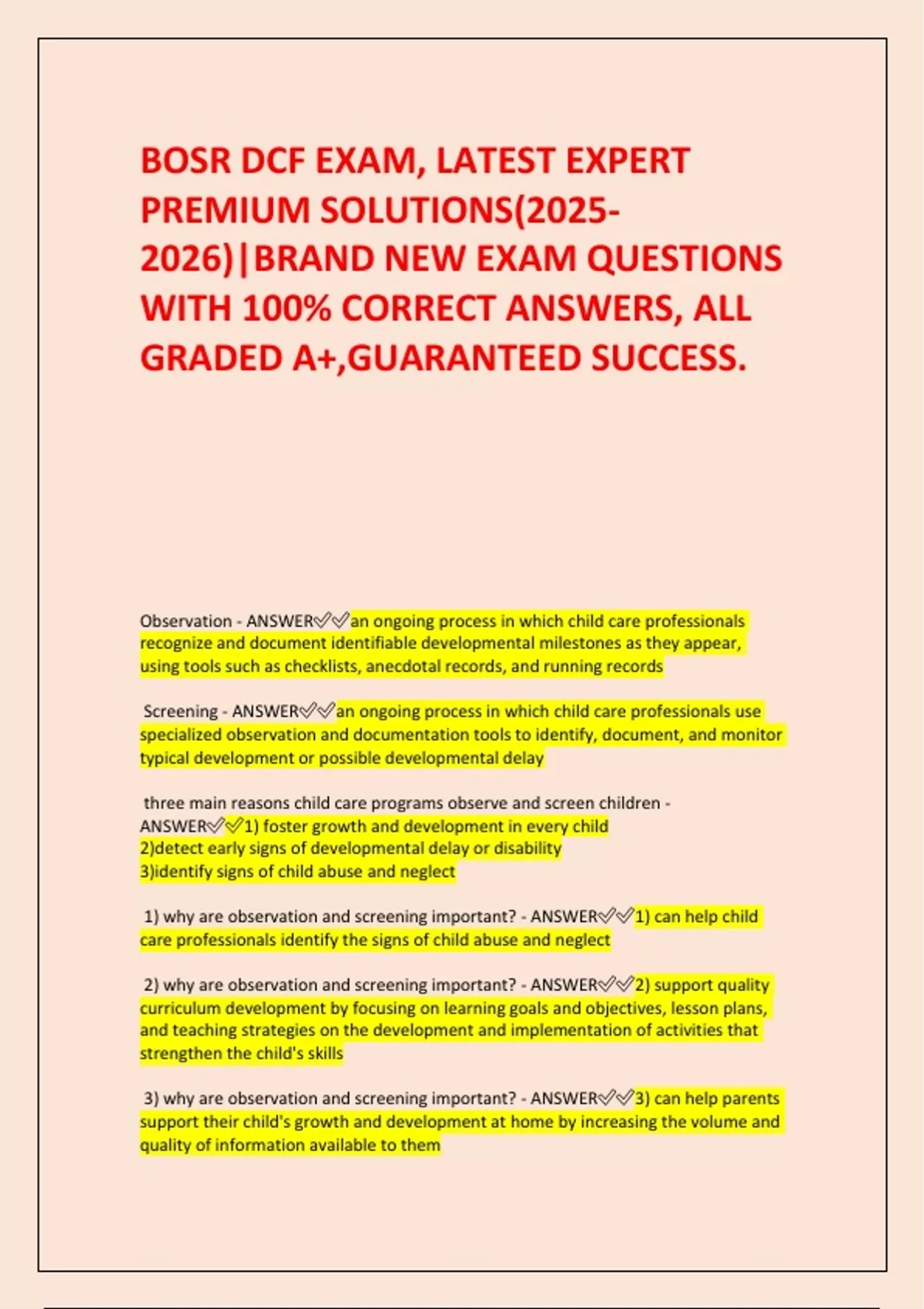 BOSR DCF EXAM, LATEST EXPERT PREMIUM SOLUTIONS()|BRAND NEW EXAM QUESTIONS WITH 100% CORRECT ANSWERS, ALL GRADED A+,GUARANTEED SUCCESS. Observation - ANSWERan ongoing process in which child care professionals recognize and document identifiable developmental milestones as they appear, using tools such as checklists, anecdotal records, and running records Screening - ANSWERan ongoing process in which child care professionals use specialized observation and documentation tools to identify, document, and monitor typical development or possible developmental delay three main reasons child care programs observe and screen children - ANSWER1) foster growth and development in every child 2)detect early signs of developmental delay or disability 3)identify signs of child abuse and neglect 1) why are observation and screening important? - ANSWER1) can help child care professionals identify the signs of child abuse and neglect 2) why are observation and screening important? - ANSWER2) support quality curriculum development by focusing on learning goals and objectives, lesson plans, and teaching strategies on the development and implementation of activities that strengthen the child's skills 3) why are observation and screening important? - ANSWER3) can help parents support their child's growth and development at home by increasing the volume and quality of information available to them