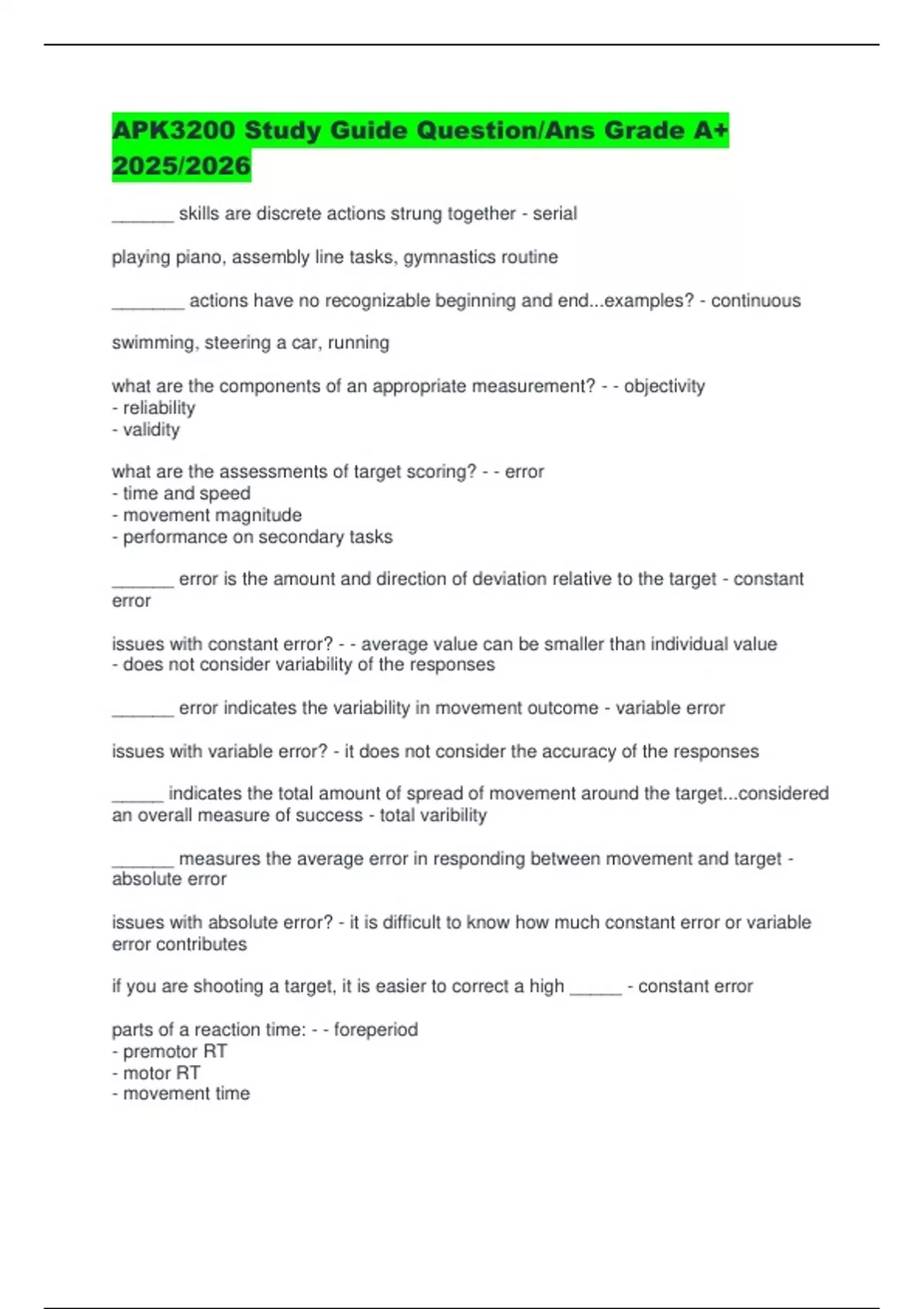 APK3200 Study Guide Question/Ans Grade A+ 2025/2026 ______ skills are discrete actions strung together - serial playing piano, assembly line tasks, gymnastics routine _______ actions have no recognizable beginning and end...examples? - continuous swimming, steering a car, running what are the components of an appropriate measurement? - - objectivity - reliability - validity what are the assessments of target scoring? - - error - time and speed - movement magnitude - performance on secondary tasks ______ error is the amount and direction of deviation relative to the target - constant error issues with constant error? - - average value can be smaller than individual value - does not consider variability of the responses ______ error indicates the variability in movement outcome - variable error issues with variable error? - it does not consider the accuracy of the responses _____ indicates the total amount of spread of movement around the target...considered an overall measure of success - total varibility