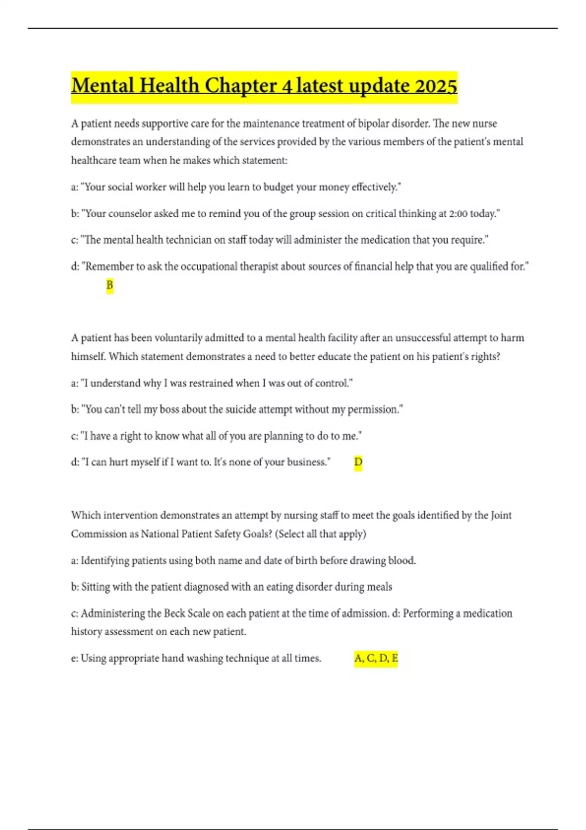 A patient needs supportive care for the maintenance treatment of bipolar disorder. The new nurse demonstrates an understanding of the services provided by the various members of the patient's mental healthcare team when he makes which statement: a: "Your social worker will help you learn to budget your money effectively." b: "Your counselor asked me to remind you of the group session on critical thinking at 2:00 today." c: "The mental health technician on staff today will administer the medication that you require." d: "Remember to ask the occupational therapist about sources of financial help that you are qualified for." B A patient has been voluntarily admitted to a mental health facility after an unsuccessful attempt to harm himself. Which statement demonstrates a need to better educate the patient on his patient's rights? a: "I understand why I was restrained when I was out of control." b: "You can't tell my boss about the suicide attempt without my permission." c: "I have a right to know what all of you are planning to do to me." d: "I can hurt myself if I want to. It's none of your business." D Which intervention demonstrates an attempt by nursing staff to meet the goals identified by the Joint Commission as National Patient Safety Goals? (Select all that apply) a: Identifying patients using both name and date of birth before drawing blood. b: Sitting with the patient diagnosed with an eating disorder during meals c: Administering the Beck Scale on each patient at the time of admission. d: Performing a medication history assessment on each new patient. e: Using appropriate hand washing technique at all times. A, C, D, E The mental health team is determining treatment options for a male patient who is experiencing psychotic symptoms. Which question(s) should the team answer to determine whether a community outpatient or inpatient setting is most appropriate? (Select all that apply) a: "Is the patient expressing suicidal thoughts?" b: "Does the patient have intact judgment and insight into his situation?" c: "Does the patient have experience with either community or inpatient mental healthcare facilities? d: "Does the patient require a therapeutic environment to support the management of psychotic symptoms?" e: "Does the patient require the regular involvement of their family / significant other in planning and executing the plan of care?" A, B, D, E
