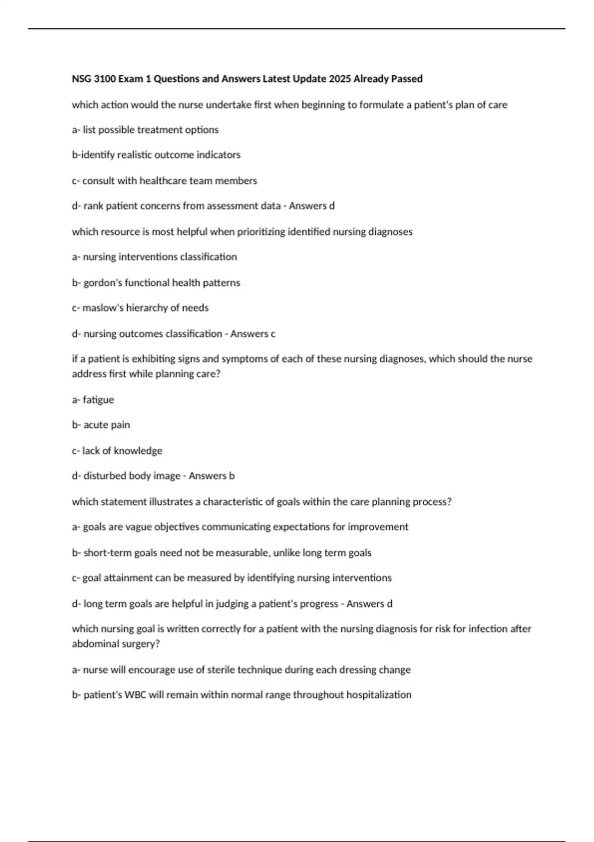 d- nursing outcomes classification - Answers c