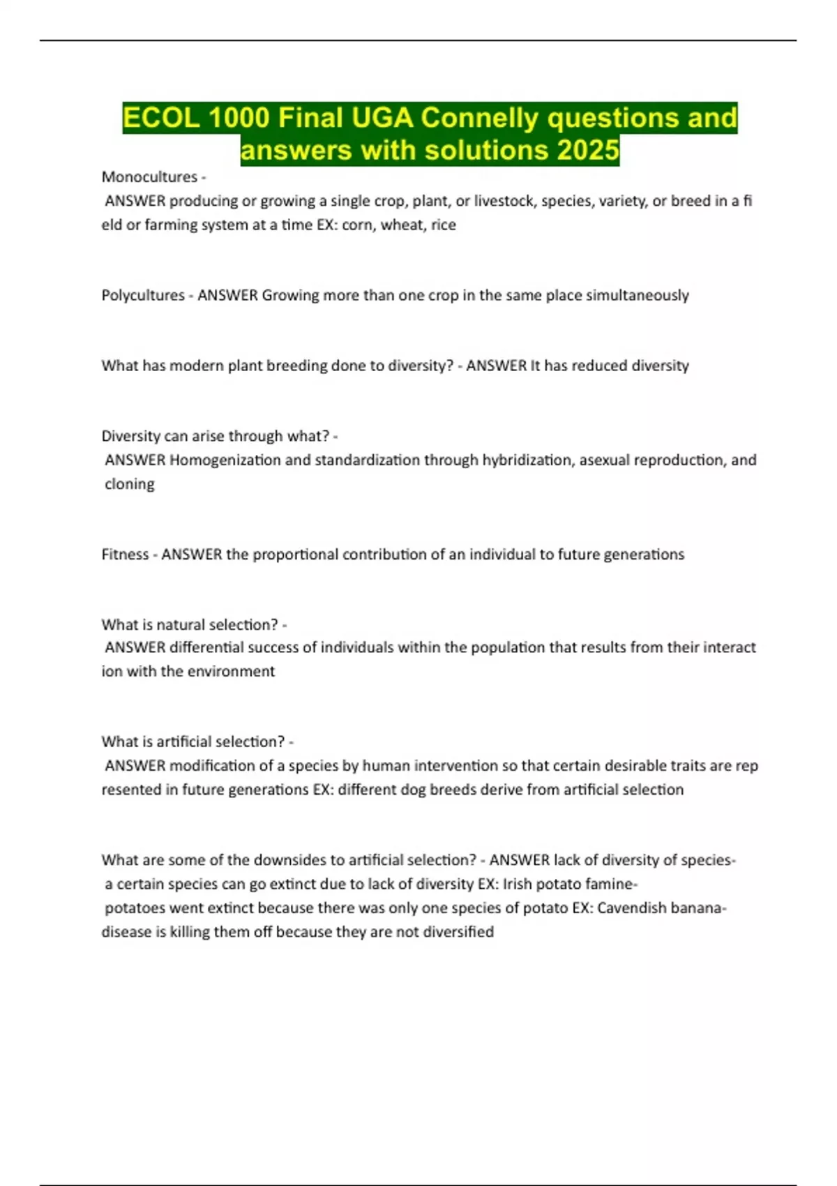 What are some of the downsides to artificial selection? - ANSWER lack of diversity of species-