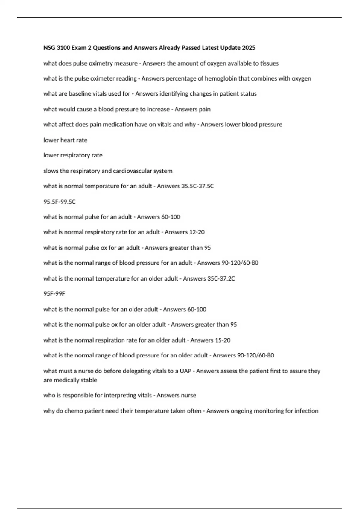 NSG 3100 Exam 2 Questions and Answers Already Passed Latest Update 2025 what does pulse oximetry measure - Answers the amount of oxygen available to tissues what is the pulse oximeter reading - Answers percentage of hemoglobin that combines with oxygen what are baseline vitals used for - Answers identifying changes in patient status what would cause a blood pressure to increase - Answers pain what affect does pain medication have on vitals and why - Answers lower blood pressure lower heart rate lower respiratory rate slows the respiratory and cardiovascular system what is normal temperature for an adult - Answers 35.5C-37.5C 95.5F-99.5C what is normal pulse for an adult - Answers 60-100 what is normal respiratory rate for an adult - Answers 12-20 what is normal pulse ox for an adult - Answers greater than 95 what is the normal range of blood pressure for an adult - Answers 90-120/60-80 what is the normal temperature for an older adult - Answers 35C-37.2C 95F-99F what is the normal pulse for an older adult - Answers 60-100 what is the normal pulse ox for an older adult - Answers greater than 95 what is the normal respiration rate for an older adult - Answers 15-20 what is the normal range of blood pressure for an older adult - Answers 90-120/60-80 what must a nurse do before delegating vitals to a UAP - Answers assess the patient first to assure they are medically stable who is responsible for interpreting vitals - Answers nurse why do chemo patient need their temperature taken often - Answers ongoing monitoring for infection why might older adults need assistance in adjusting to temperature - Answers cognitive impairment, physical issues what does afebrile mean - Answers a person who is maintaining the normal temperature how does axillary temperature compare to oral readings - Answers approx 1 degree less than oral how does axillary temperature compare to rectal - Answers approximately 1 degree less than rectal what part of the body regulates body temperature - Answers hypothalamus how does the anterior hypothalamus regulate heat loss - Answers diaphoresis (sweating) and vasodilation of blood vessels what is metabolism in relation to heat production - Answers the chemical process responsible for generating energy for cellular functions what organ regulates heat production and loss - Answers the skin through insulation of the body with subcutaneous tissue and fat how does age affect temperature - Answers baseline temperature drops as a person ages how does exercise affect temperature - Answers temperature increases during exercise how does hormone fluctuations affect temperature - Answers women have higher temperature during ovulation how does circadian rhythms affect temperature - Answers lowest at 3am and highest at 6pm how does stress affect temperature - Answers levels of epinephrine and norepinephrine can increase during emotional and physical stress which increases temperature how does smoking affect temperature - Answers causes vasoconstriction which causes a drop in the temperature of the skin and mucous membranes what are signs of hypotension - Answers decreased body temperature pale and cool skin decreased muscle coordination decreased urinary output drowsiness where are common sites for frostbite - Answers earlobes tip of the nose fingers toes what does febrile mean - Answers a person with a fever what could a fever be associated with - Answers infection tissue injury cancer trauma surgery what are risk factors for a heatstroke - Answers very young very old cardiovascular disease diabetes alcoholism what are signs and symptoms of heat stroke - Answers confusion delirium