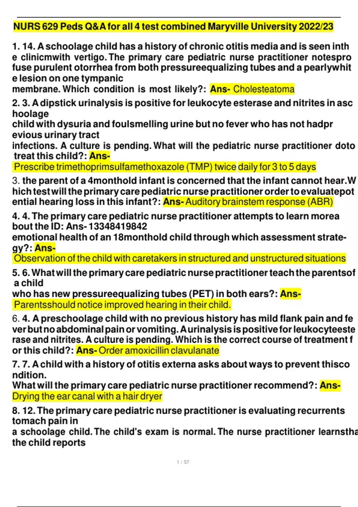 NURS 629 Peds Q&A for all 4 test combined Maryville University 2022/23
