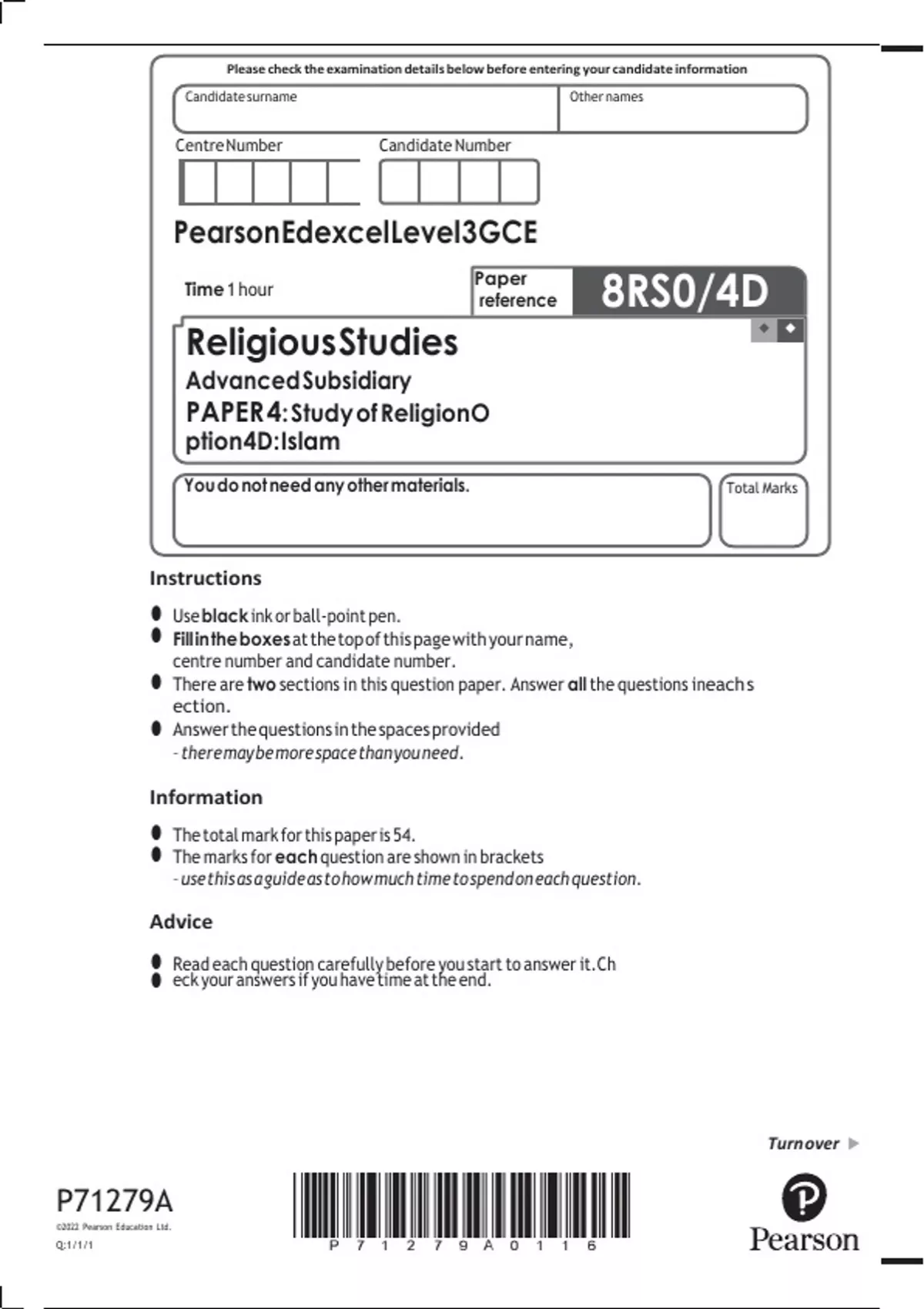 Pearson Edexcel Level 3 GCE Religious Studies Advanced Subsidiary PAPER 4 Study of Religion Option