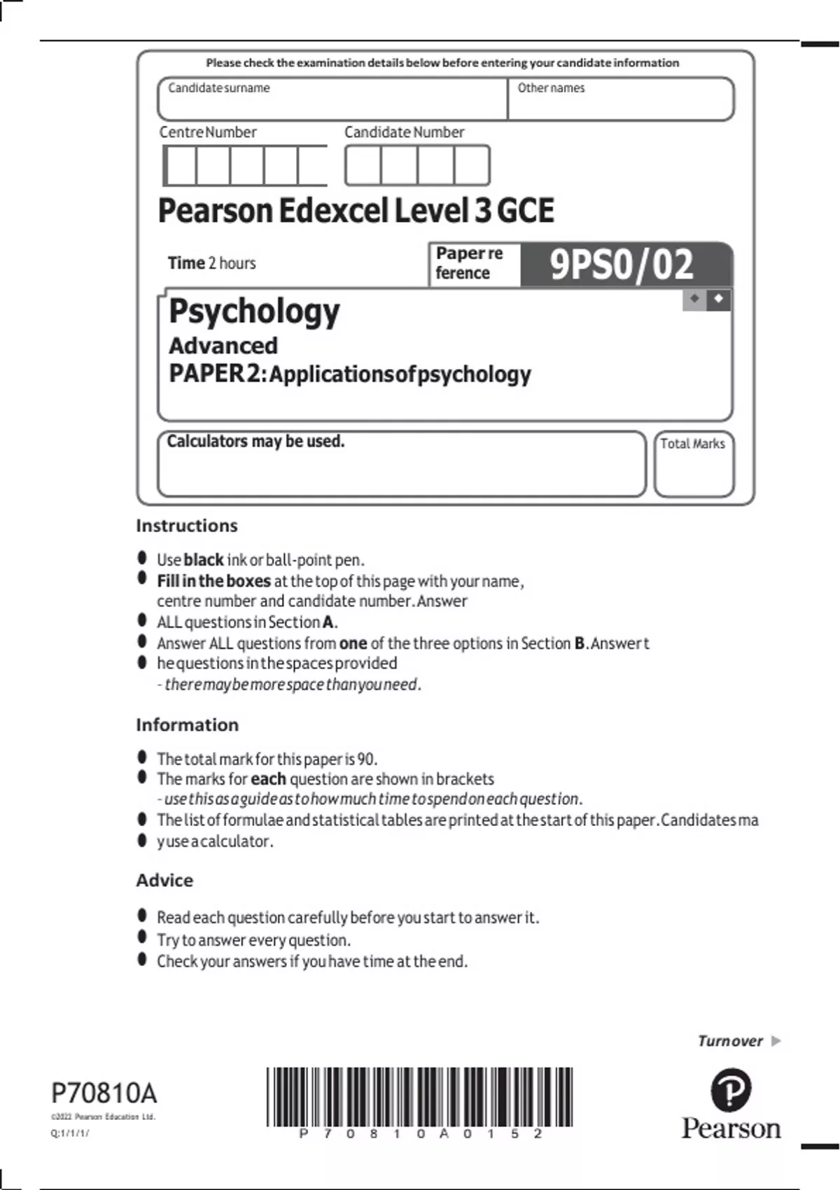 Pearson Edexcel Level 3 GCE Psychology Advanced PAPER 2 Applications of psychology