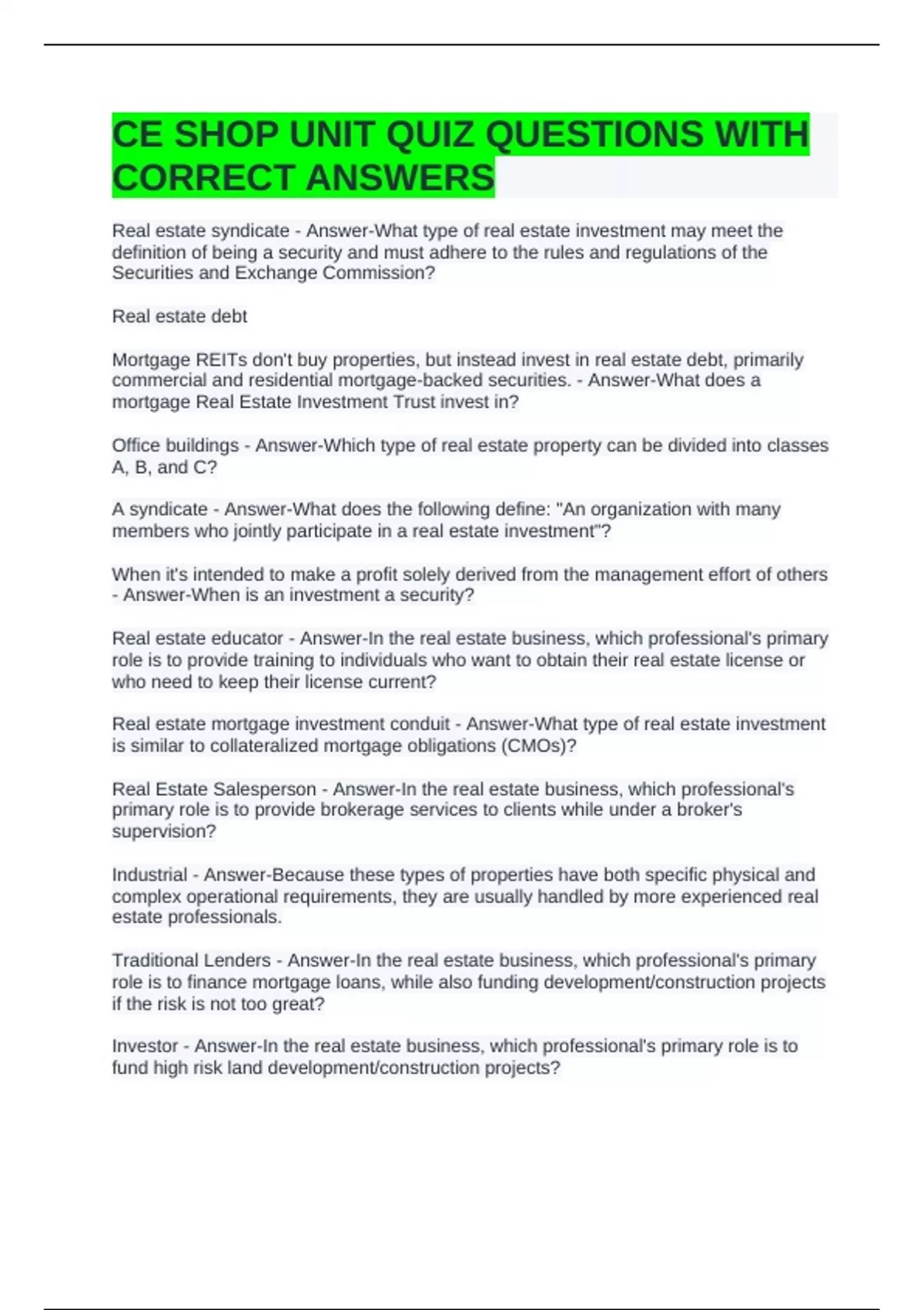 CE SHOP UNIT QUIZ QUESTIONS WITH