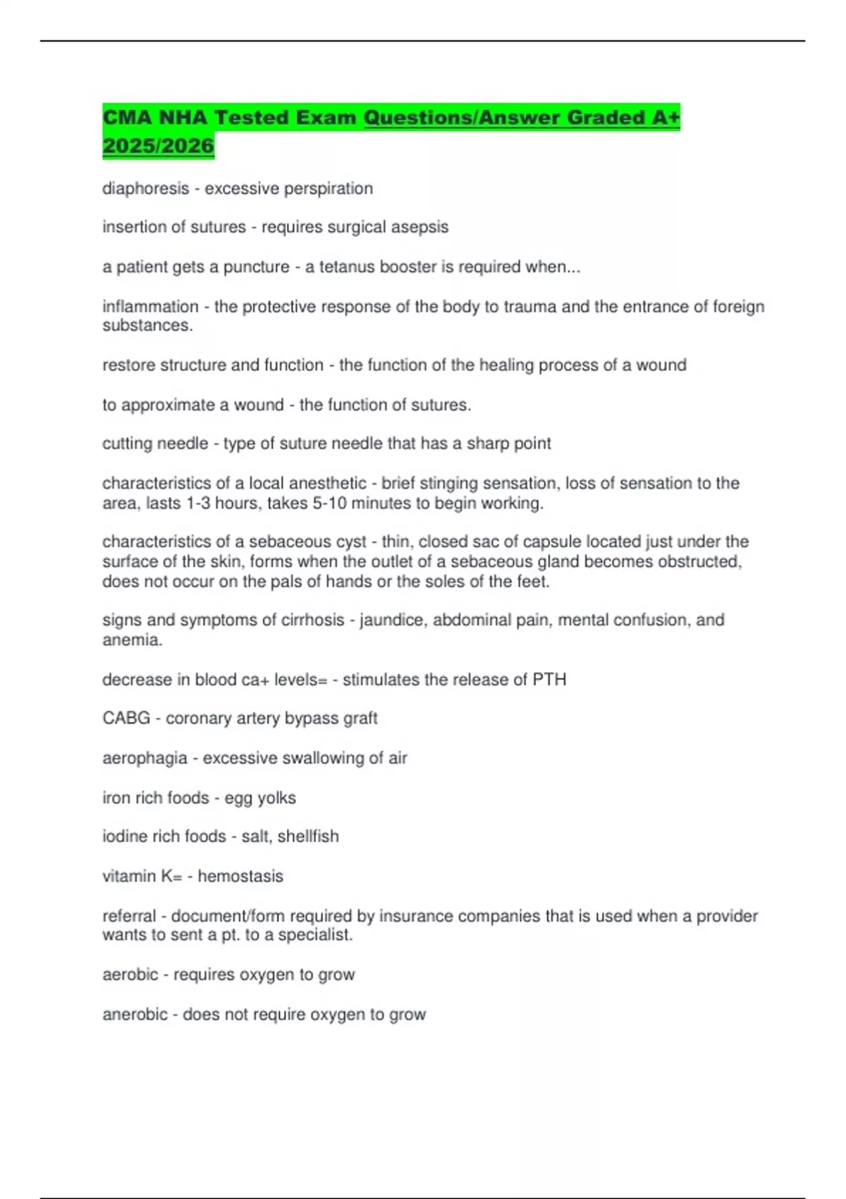 CMA NHA Tested Exam Questions/Answer Graded A+ 2025/2026 diaphoresis - excessive perspiration insertion of sutures - requires surgical asepsis a patient gets a puncture - a tetanus booster is required when... inflammation - the protective response of the body to trauma and the entrance of foreign substances. restore structure and function - the function of the healing process of a wound to approximate a wound - the function of sutures. cutting needle - type of suture needle that has a sharp point characteristics of a local anesthetic - brief stinging sensation, loss of sensation to the area, lasts 1-3 hours, takes 5-10 minutes to begin working. characteristics of a sebaceous cyst - thin, closed sac of capsule located just under the surface of the skin, forms when the outlet of a sebaceous gland becomes obstructed, does not occur on the pals of hands or the soles of the feet. signs and symptoms of cirrhosis - jaundice, abdominal pain, mental confusion, and anemia. decrease in blood ca+ levels= - stimulates the release of PTH