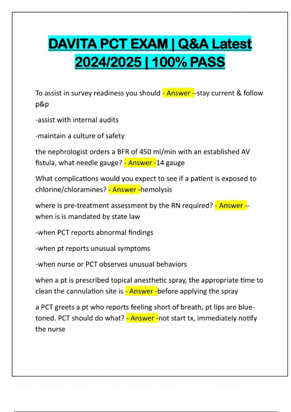 DAVITA PCT EXAM | Q&A Latest 2024/2025 | 100% PASS To assist in survey readiness you should - Answer --stay current & follow p&p -assist with internal audits -maintain a culture of safety the nephrologist orders a BFR of 450 ml/min with an established AV fistula, what needle gauge? - Answer -14 gauge What complications would you expect to see if a patient is exposed to chlorine/chloramines? - Answer -hemolysis where is pre-treatment assessment by the RN required? - Answer -- when is is mandated by state law -when PCT reports abnormal findings -when pt reports unusual symptoms -when nurse or PCT observes unusual behaviors when a pt is prescribed topical anesthetic spray, the appropriate time to clean the cannulation site is - Answer -before applying the spray a PCT greets a pt who reports feeling short of breath, pt lips are bluetoned. PCT should do what? - Answer -not start tx, immediately notify the nurse