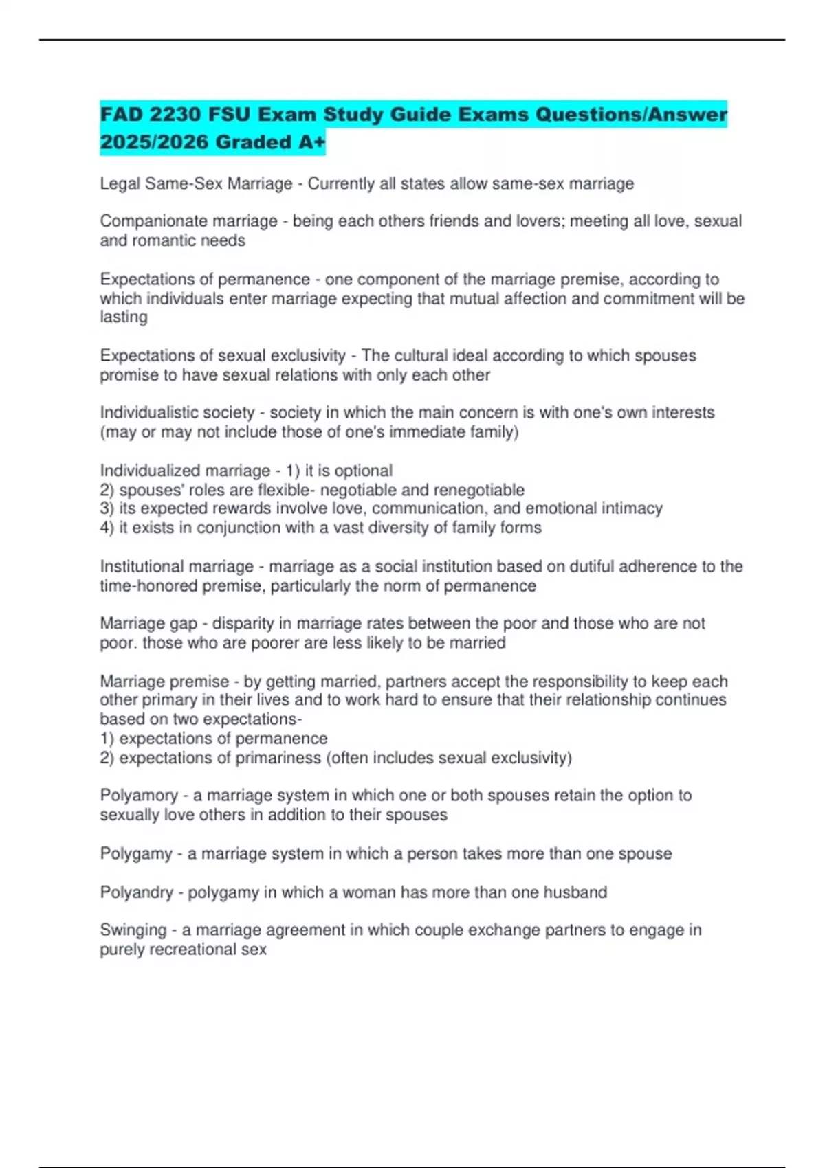 FAD 2230 FSU Exam Study Guide Exams Questions/Answer 2025/2026 Graded A+ Legal Same-Sex Marriage - Currently all states allow same-sex marriage Companionate marriage - being each others friends and lovers; meeting all love, sexual and romantic needs Expectations of permanence - one component of the marriage premise, according to which individuals enter marriage expecting that mutual affection and commitment will be lasting Expectations of sexual exclusivity - The cultural ideal according to which spouses promise to have sexual relations with only each other Individualistic society - society in which the main concern is with one's own interests (may or may not include those of one's immediate family) Individualized marriage - 1) it is optional 2) spouses' roles are flexible- negotiable and renegotiable 3) its expected rewards involve love, communication, and emotional intimacy 4) it exists in conjunction with a vast diversity of family forms