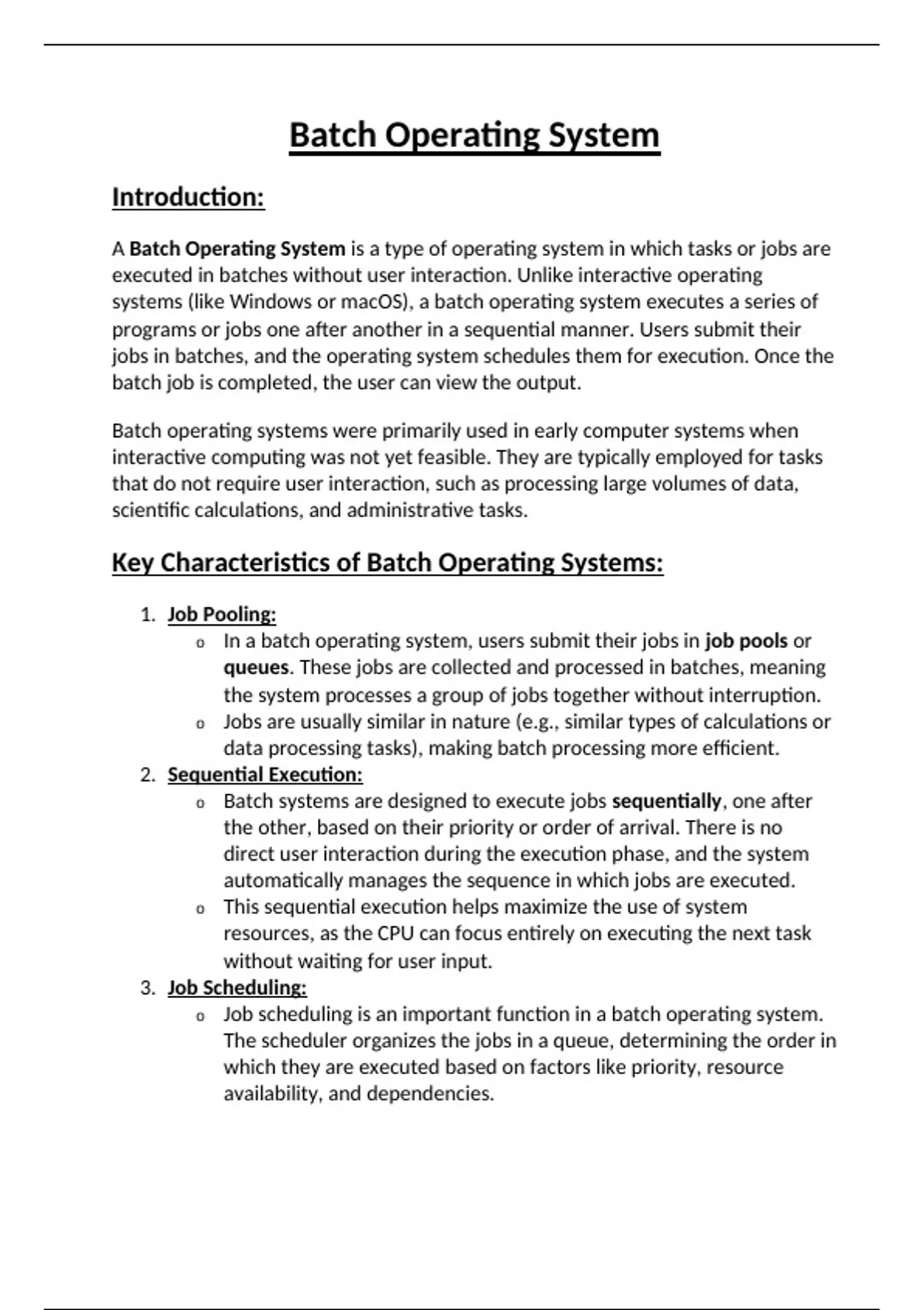 This document explores the Batch Operating System, focusing on job scheduling, process automation, and offline task execution. It explains how batch processing improves efficiency by grouping similar tasks and executing them sequentially without user intervention.