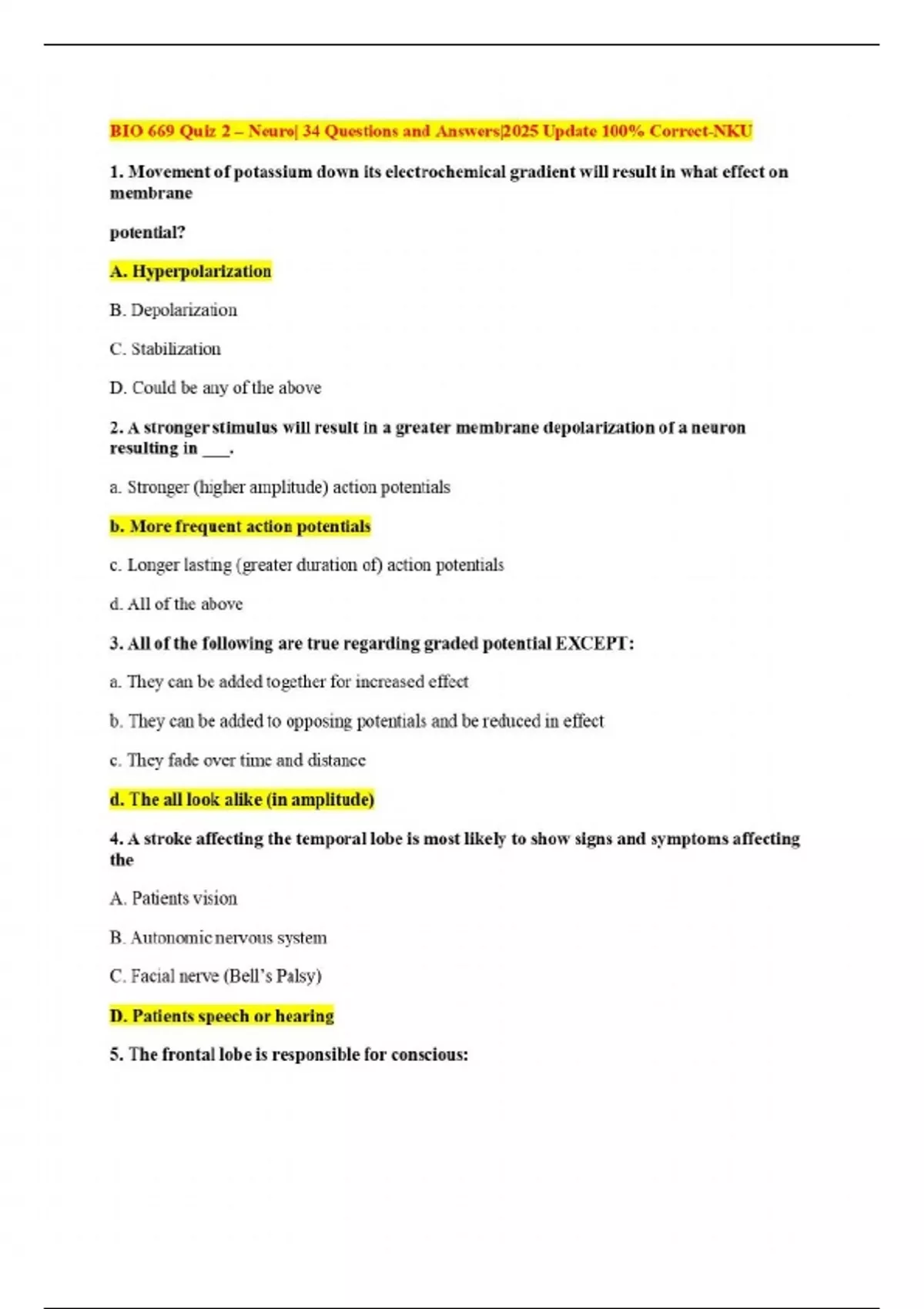 BIO 669 Quiz 2 – Neuro| 34 Questions and Answers|2025 Update 100% Correct-NKU