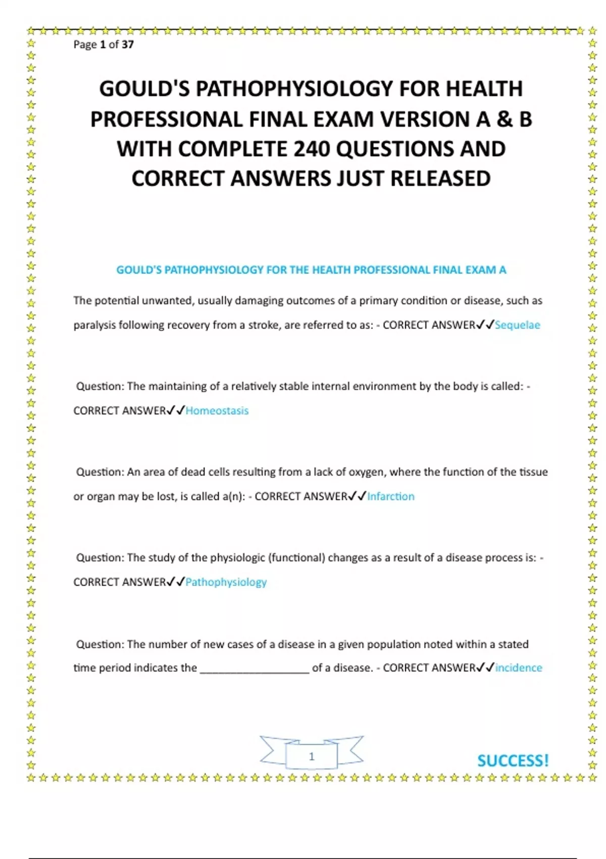 GOULD'S PATHOPHYSIOLOGY FOR HEALTH PROFESSIONAL FINAL EXAM VERSION A & B WITH COMPLETE 240 QUESTIONS AND CORRECT ANSWERS JUST RELEASED