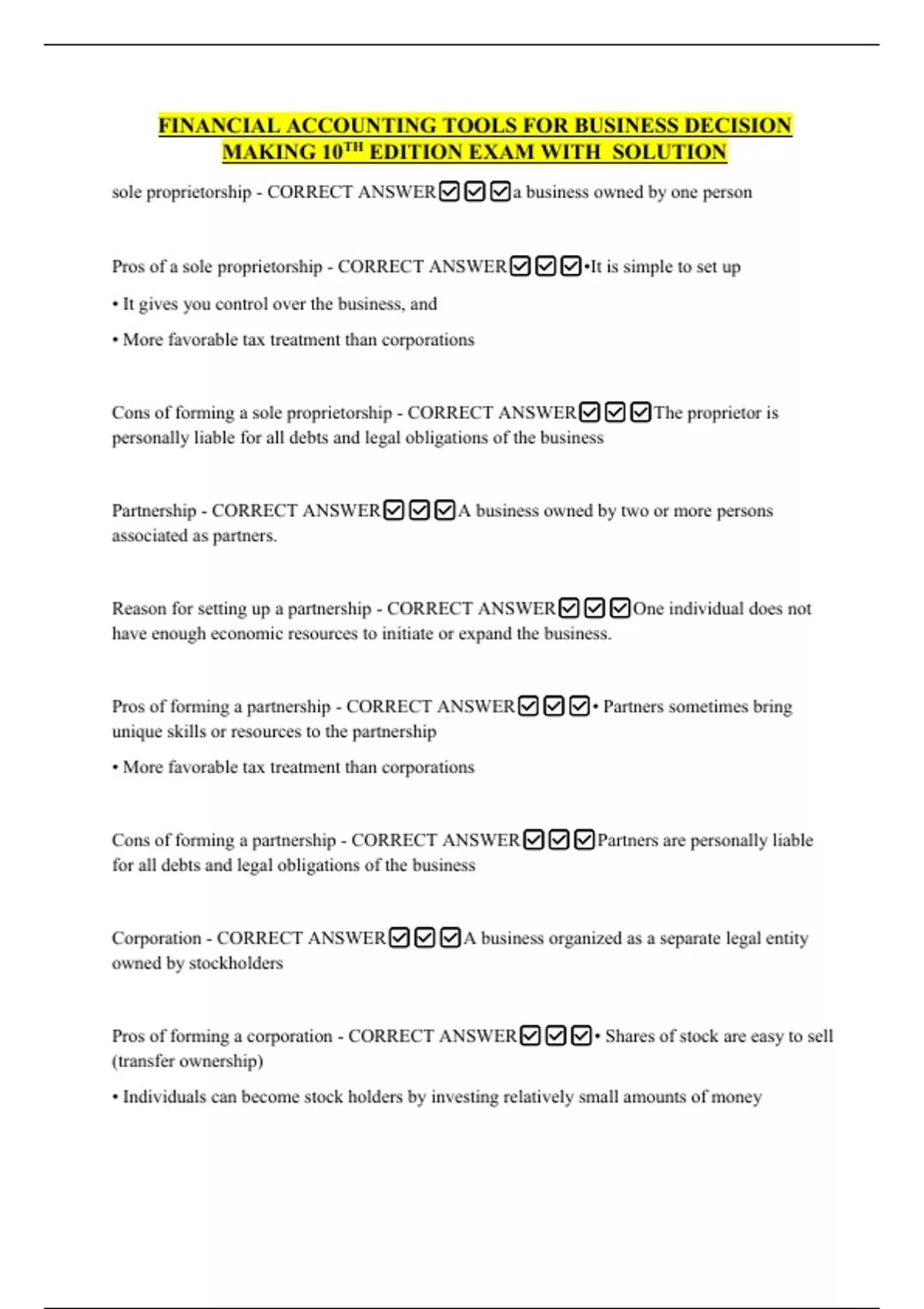 FINANCIAL ACCOUNTING TOOLS FOR BUSINESS DECISION MAKING 10TH EDITION EXAM WITH SOLUTION sole proprietorship - CORRECT ANSWERa business owned by one person Pros of a sole proprietorship - CORRECT ANSWER•It is simple to set up • It gives you control over the business, and • More favorable tax treatment than corporations