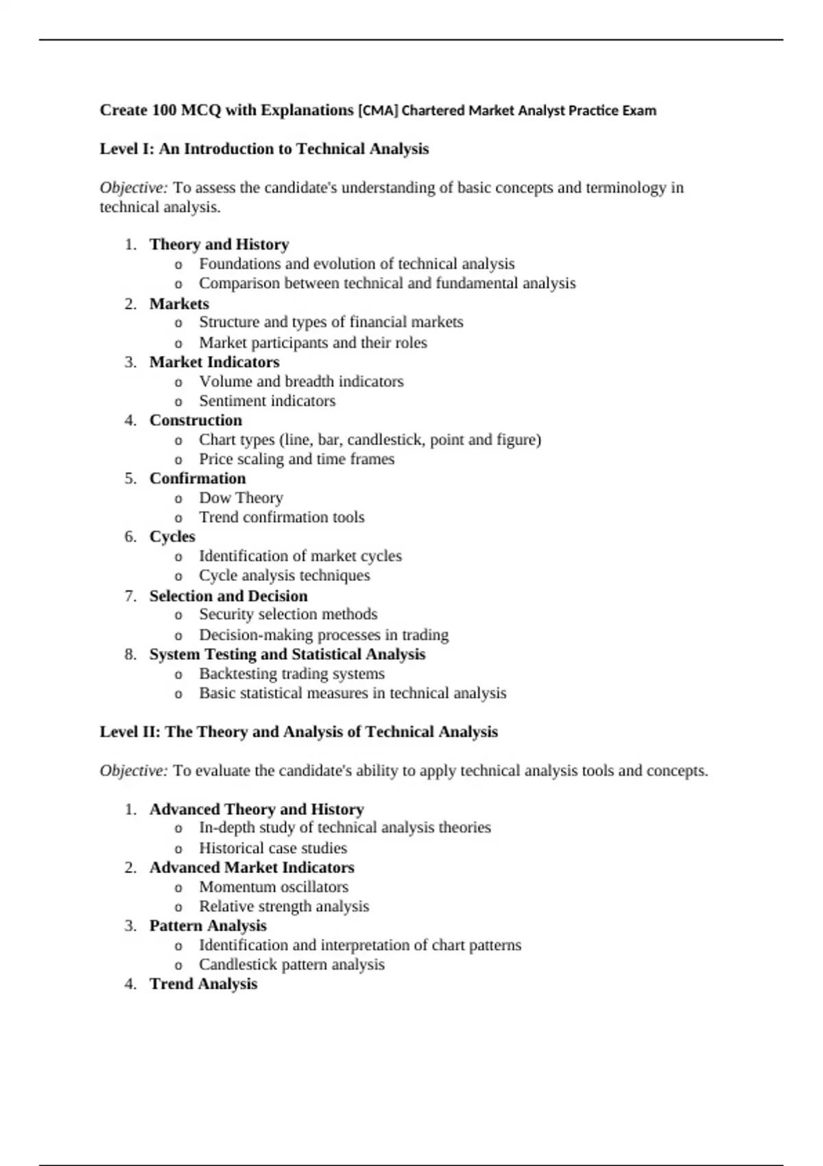 Create 100 MCQ with Explanations [CMA] Chartered Market Analyst Practice Exam Level I: An Introduction to Technical Analysis Objective: To assess the candidate's understanding of basic concepts and terminology in technical analysis. 1. Theory and History o Foundations and evolution of technical analysis o Comparison between technical and fundamental analysis 2. Markets o Structure and types of financial markets o Market participants and their roles 3. Market Indicators o Volume and breadth indicators o Sentiment indicators 4. Construction o Chart types (line, bar, candlestick, point and figure) o Price scaling and time frames 5. Confirmation o Dow Theory o Trend confirmation tools 6. Cycles o Identification of market cycles o Cycle analysis techniques 7. Selection and Decision o Security selection methods o Decision-making processes in trading 8. System Testing and Statistical Analysis o Backtesting trading systems o Basic statistical measures in technical analysis Level II: The Theory and Analysis of Technical Analysis Objective: To evaluate the candidate's ability to apply technical analysis tools and concepts. 1. Advanced Theory and History o In-depth study of technical analysis theories o Historical case studies 2. Advanced Market Indicators o Momentum oscillators o Relative strength analysis 3. Pattern Analysis o Identification and interpretation of chart patterns o Candlestick pattern analysis 4. Trend Analysis o Trend identification and classification o Trendline construction and analysis 5. Volume Analysis o Volume-based indicators o Price-volume relationships 6. Risk Management o Position sizing strategies o Stop-loss techniques 7. System Development and Testing o Developing trading systems o Optimization and validation of systems 8. Statistical Analysis o Probability distributions o Correlation and regression analysis Level III: The Integration of Technical Analysis Objective: To assess the candidate's competency in integrating technical analysis with other analytical tools and techniques for portfolio management. 1. Ethics o Professional conduct and ethical considerations o Application of ethical principles in technical analysis 2. Risk Management o Advanced risk assessment techniques o Hedging strategies 3. Asset Relationships o Intermarket analysis o Correlation between asset classes 4. Portfolio Management o Incorporating technical analysis into portfolio strategies o Performance measurement and attribution 5. Behavioral Finance o Psychological biases in market behavior o Impact of investor behavior on market trends 6. Volatility Analysis o Volatility measurement tools o Strategies for trading in volatile markets 7. Classical Methods o Elliott Wave Theory o Fibonacci retracements and projections