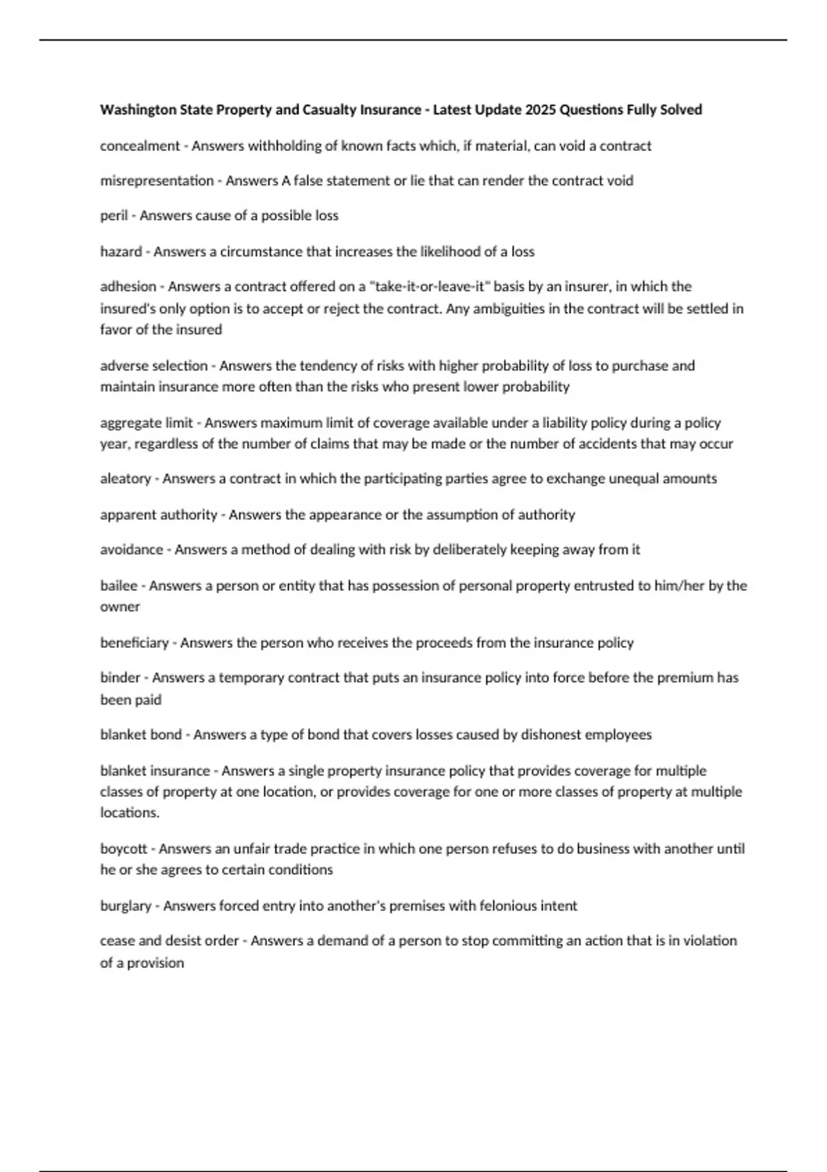 Washington State Property and Casualty Insurance - Latest Update 2025 Questions Fully Solved concealment - Answers withholding of known facts which, if material, can void a contract misrepresentation - Answers A false statement or lie that can render the contract void peril - Answers cause of a possible loss hazard - Answers a circumstance that increases the likelihood of a loss adhesion - Answers a contract offered on a "take-it-or-leave-it" basis by an insurer, in which the insured's only option is to accept or reject the contract. Any ambiguities in the contract will be settled in favor of the insured adverse selection - Answers the tendency of risks with higher probability of loss to purchase and maintain insurance more often than the risks who present lower probability aggregate limit - Answers maximum limit of coverage available under a liability policy during a policy year, regardless of the number of claims that may be made or the number of accidents that may occur aleatory - Answers a contract in which the participating parties agree to exchange unequal amounts apparent authority - Answers the appearance or the assumption of authority avoidance - Answers a method of dealing with risk by deliberately keeping away from it bailee - Answers a person or entity that has possession of personal property entrusted to him/her by the owner beneficiary - Answers the person who receives the proceeds from the insurance policy binder - Answers a temporary contract that puts an insurance policy into force before the premium has been paid blanket bond - Answers a type of bond that covers losses caused by dishonest employees blanket insurance - Answers a single property insurance policy that provides coverage for multiple classes of property at one location, or provides coverage for one or more classes of property at multiple locations. boycott - Answers an unfair trade practice in which one person refuses to do business with another until he or she agrees to certain conditions burglary - Answers forced entry into another's premises with felonious intent cease and desist order - Answers a demand of a person to stop committing an action that is in violation of a provision certificate of insurance - Answers a legal document that indicates that an insurance policy has been issued, and that states both the amounts and types of insurance provided class rating - Answers the practice of computing a price per unit of insurance that applies to all applicants possessing a given set of characteristics