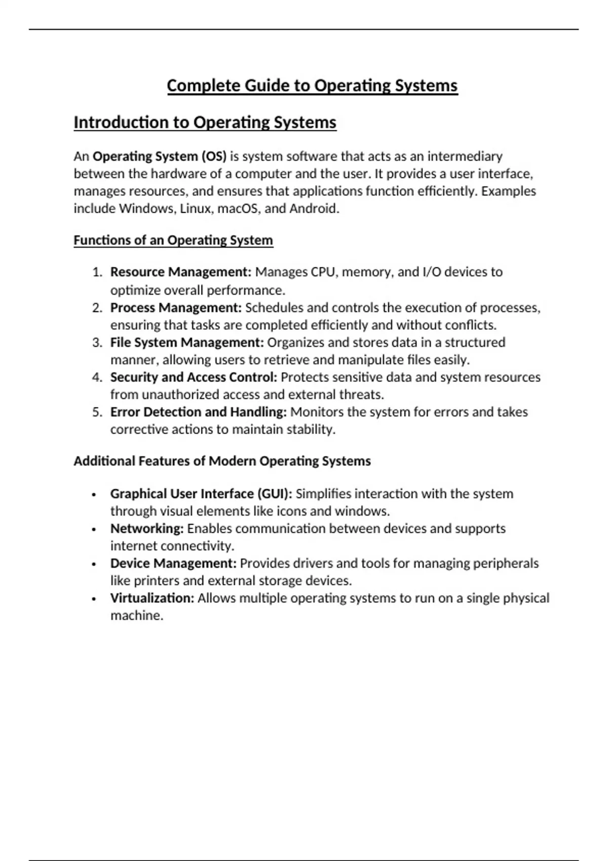 This document provides a comprehensive guide to operating systems, covering architecture, process and memory management, file systems, multitasking, scheduling algorithms, and security mechanisms. It explains how OS manages hardware, software, and user interactions efficiently.