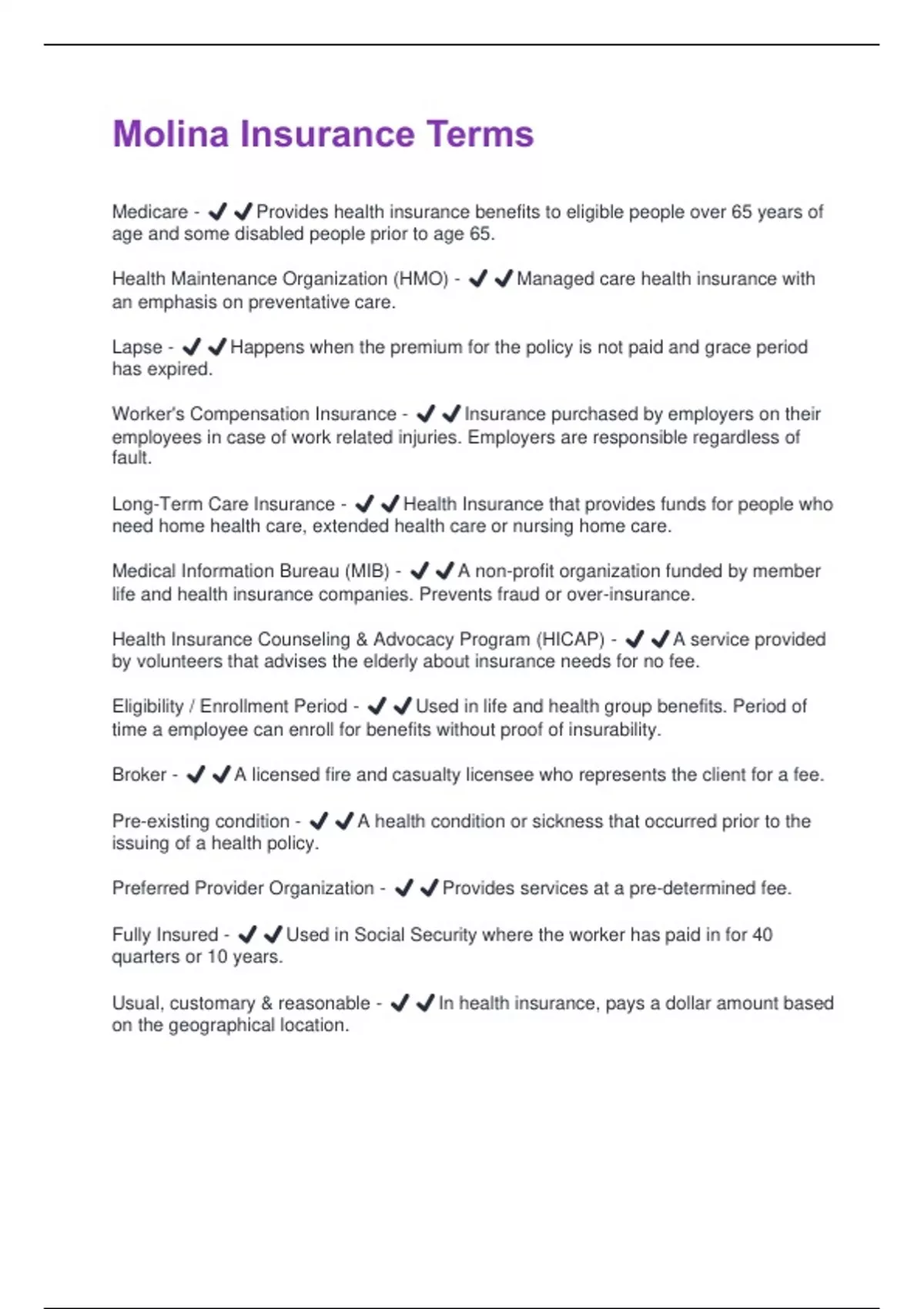 Molina Insurance Terms (100% correct and graded A+)