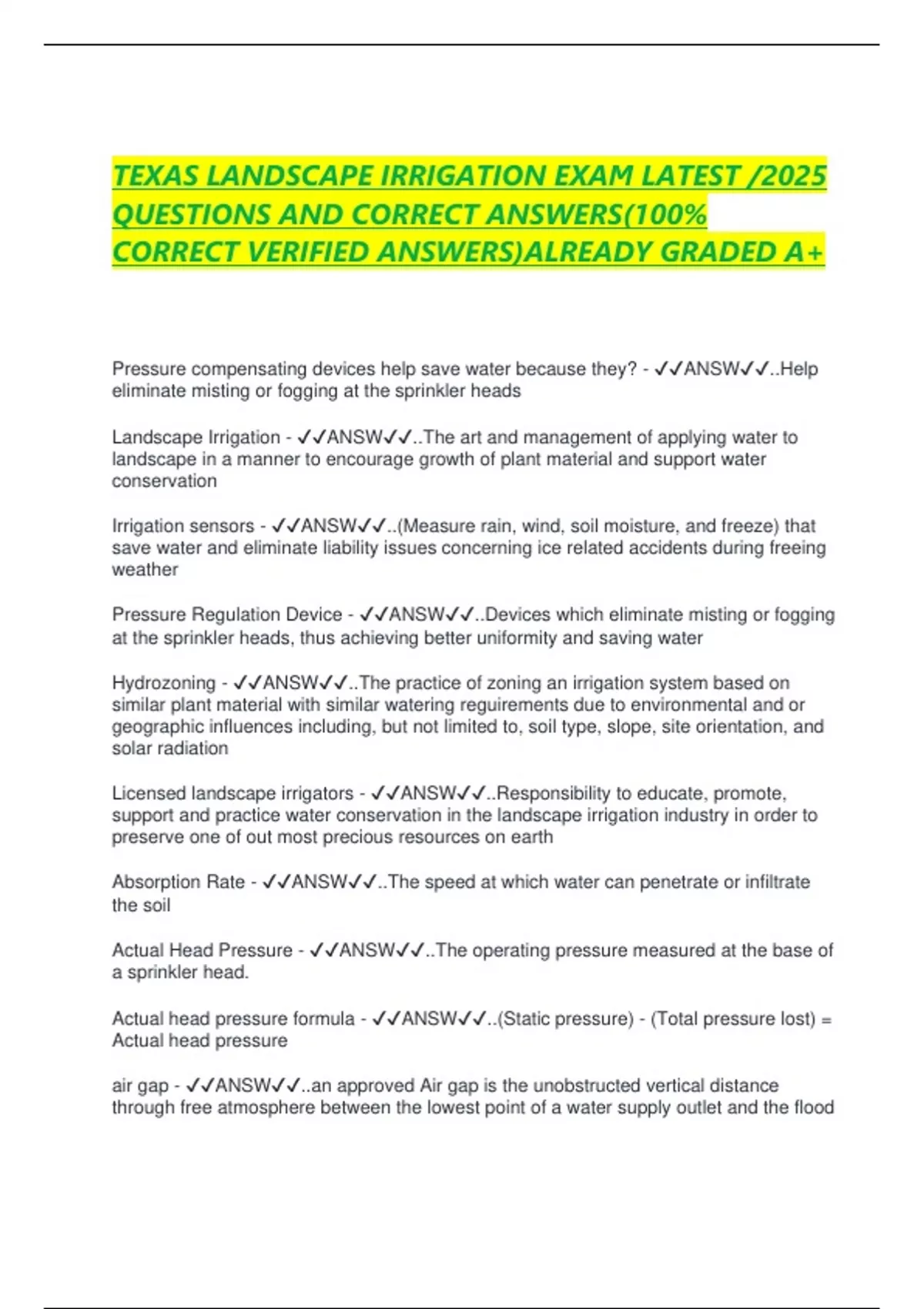 TEXAS LANDSCAPE IRRIGATION EXAM LATEST /2025 QUESTIONS AND CORRECT ANSWERS(100% CORRECT VERIFIED ANSWERS)ALREADY GRADED A+ Pressure compensating devices help save water because they? - ANSW..Help eliminate misting or fogging at the sprinkler heads