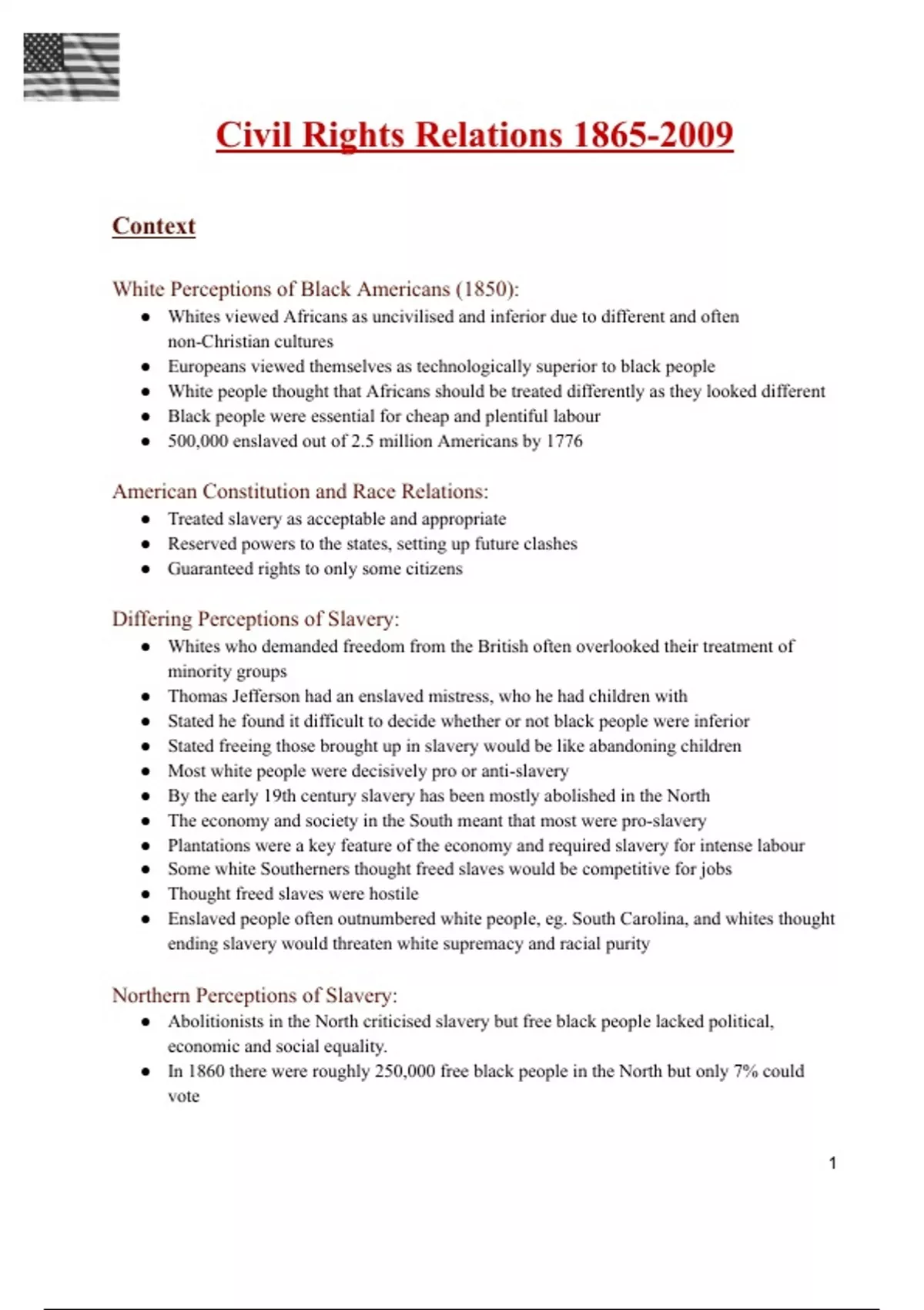 Struggling to keep up with Civil Rights history? These expertly crafted A-level notes cover everything you need to know from 1865 to 2009*– including key events, influential figures, and critical analysis to ace your exams. Don’t waste time with scattered resources! These notes streamline your revision, provide exam-ready arguments, and include vital synoptic links to impress examiners. Whether you're tackling essays, source analysis, or thematic questions, these notes give you the edge to achieve the top grades. Study smarter, not harder, and secure your A!*
